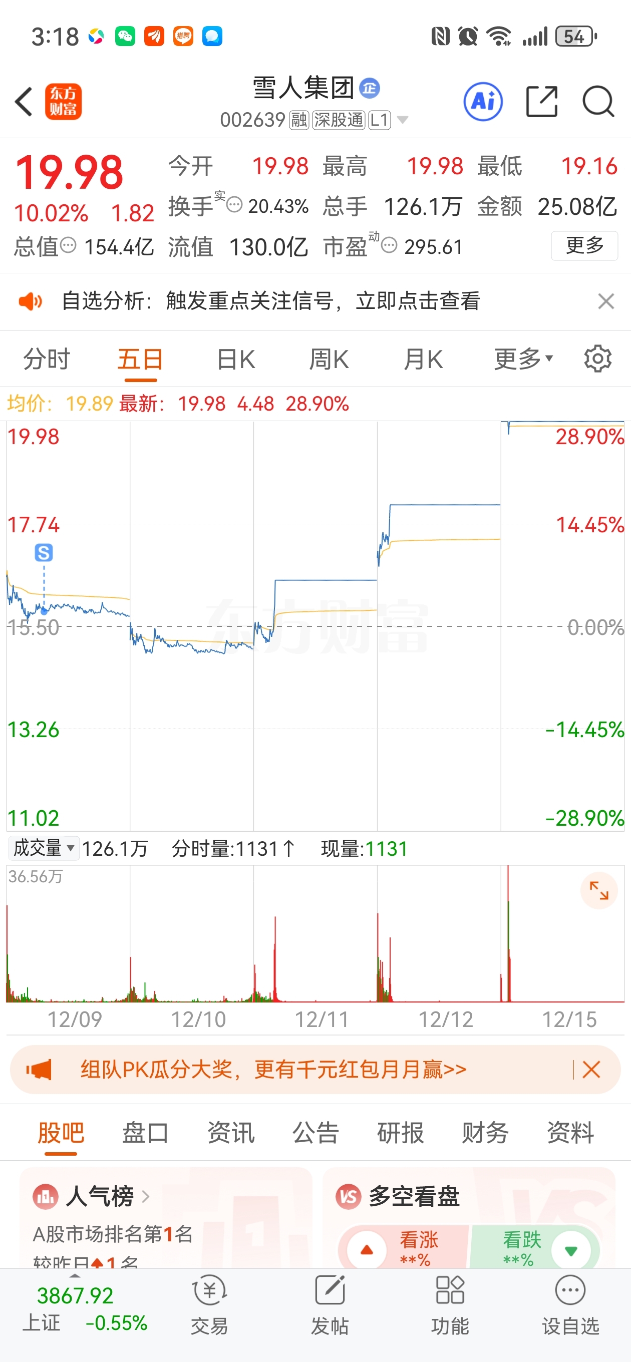 $雪人集团(SZ002639)$ 我该说点啥好呢#炒股日记#