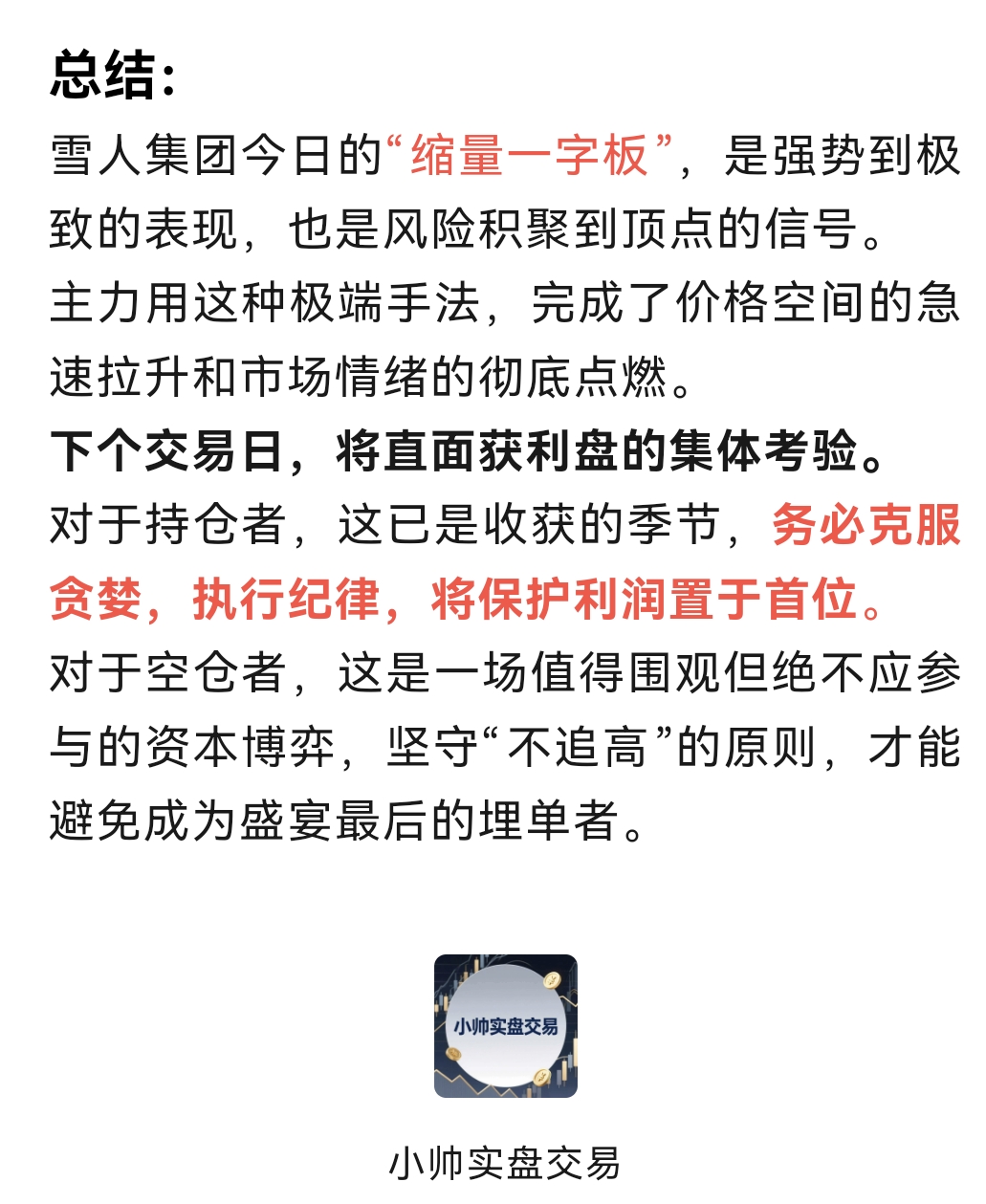 雪人集团今日的“缩量一字板”,是强势到极致的表现,也是风险积聚到顶点的信号。
