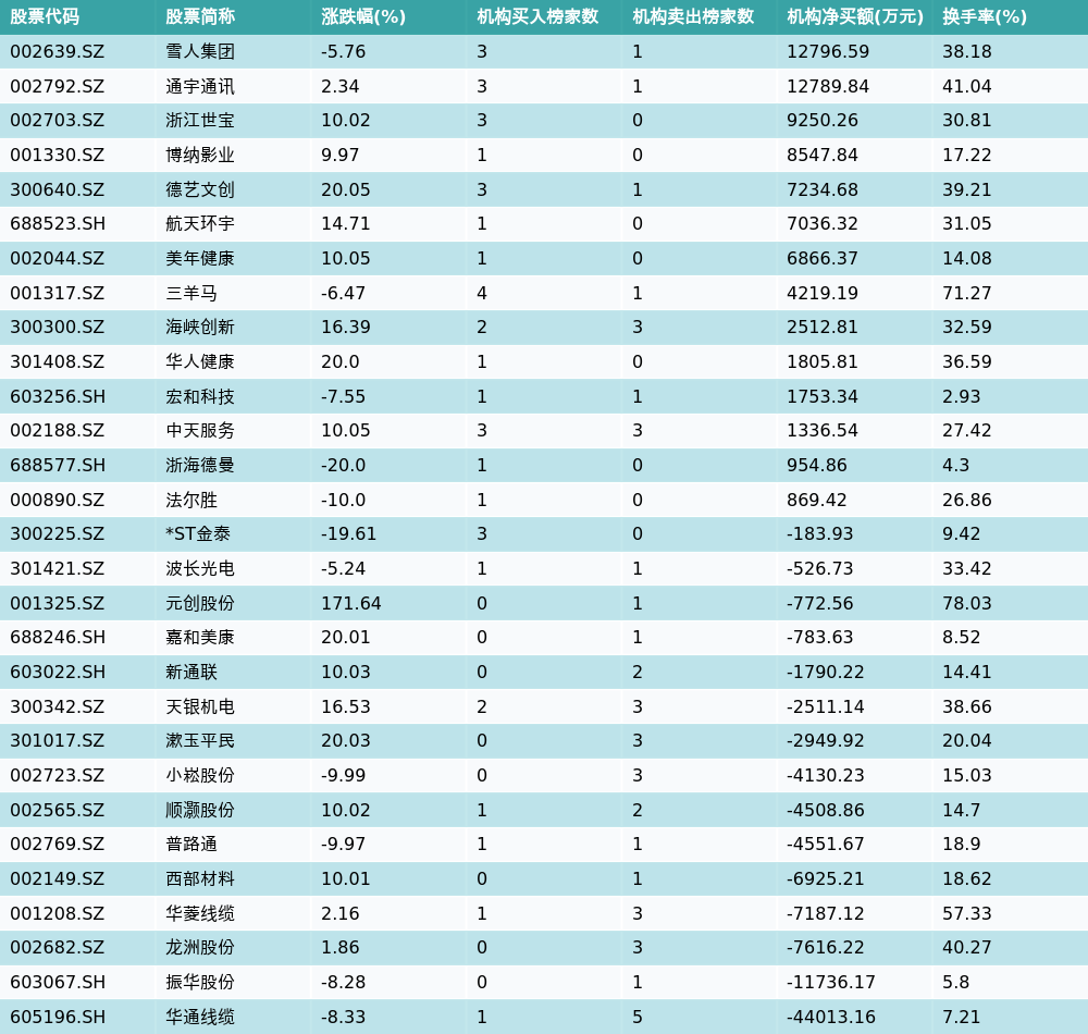 南财智讯12月18日电,南财金融终端数据显示,因当日异动登上龙虎榜的个股中,29只沪深A股龙虎榜出现了机构的身影,机构合计净卖出22212.9万元,具体来看,机构净买入14只个股,净卖出15只个股。其中,机构净买入前三分别为雪人集团(002639.SZ)、通宇通讯(002792.SZ)与浙江世宝(002703.SZ),详情见下图:机构净卖出的个股中,前三分别为华通线缆(605196.SH)、振华股份(603067.SH)与龙洲股份(002682.SZ)。