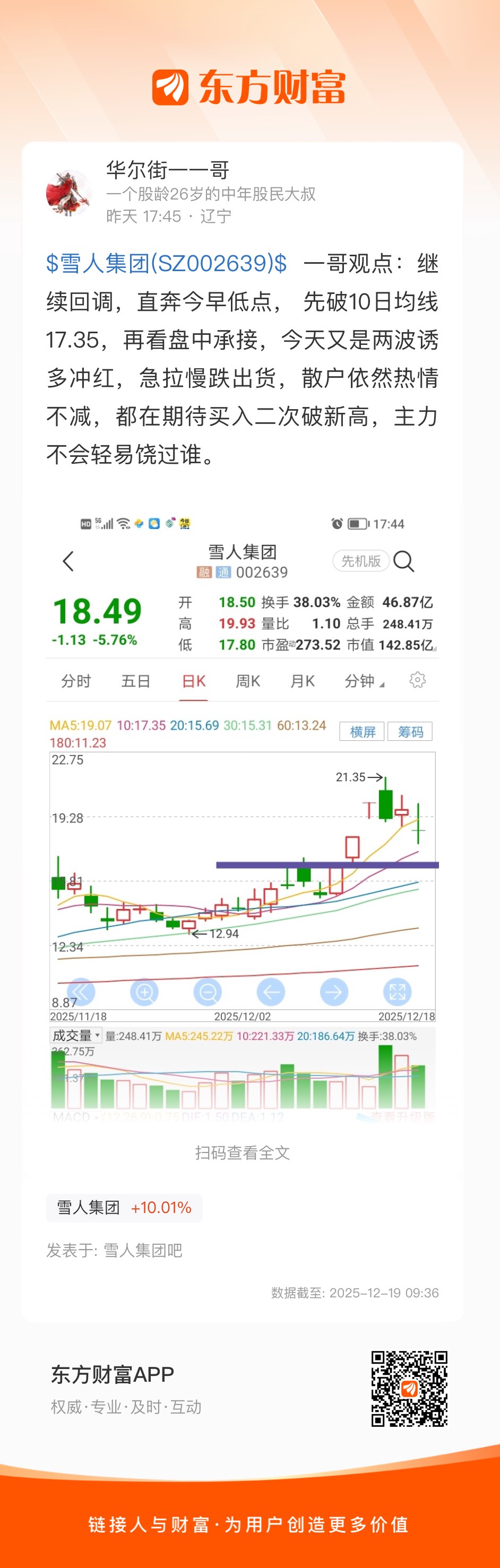 $雪人集团(SZ002639)$ 一哥观点:继续回调,直奔今早低点, 先破10日均线17.35,再看盘中承接,今天又是两波诱多冲红,急拉慢跌出货,散户依然热情不减,都在期待买入二次破新高,主力不会轻易饶过谁。