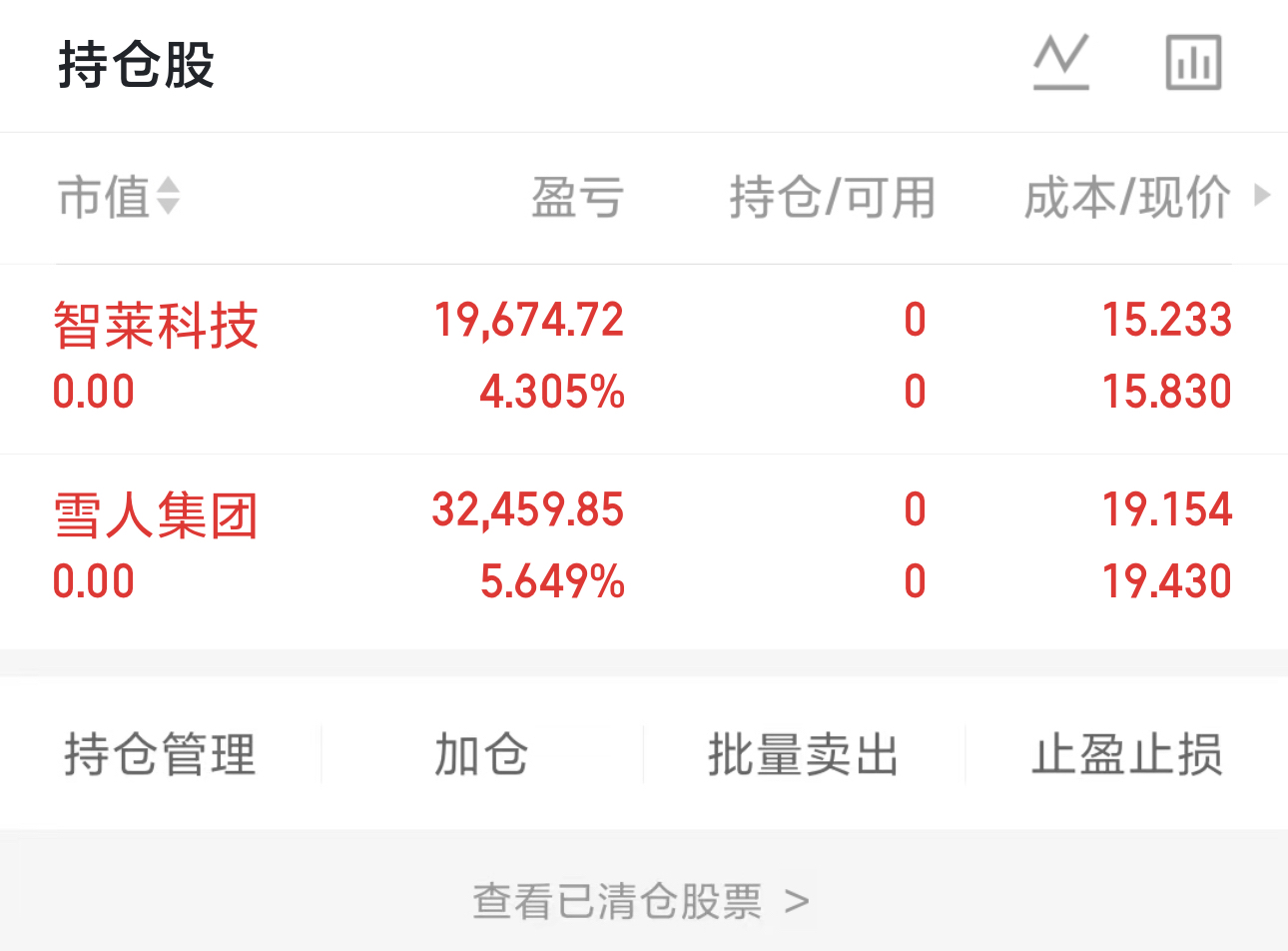 今作,完成$雪人集团(SZ002639)$ $智莱科技(SZ300771)$ 的止盈卖出,目的是兑现前期盈利,规避当前市场环境下的个股波动风险,落袋为安。清出仓位寻找下一标的!股市起落不过是寻常,每一次震荡都是打磨心态的试炼!只要A股的交易钟声还在响起,我们就手握无限机遇,耐心蛰伏,静待属于自己的高光时刻,认同的朋友点赞走起!