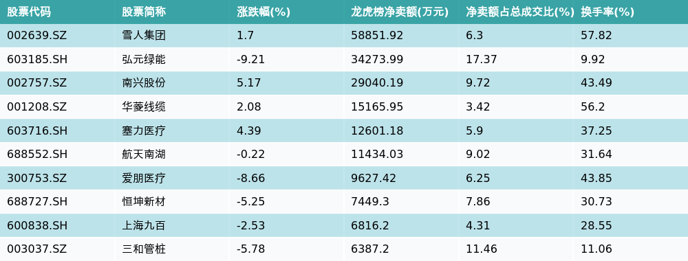 21智讯1月9日电,南财金融终端数据显示,因当日异动登上龙虎榜的个股中,龙虎榜中资金净流出最多的前三位分别是雪人集团(002639.SZ)、弘元绿能(603185.SH)与南兴股份(002757.SZ)。其中排名第一的雪人集团被净卖出5.89亿元,占总成交金额的6.3%。雪人集团收盘上涨1.7%,换手率为57.82%。净卖出额前10个股详情见下图: