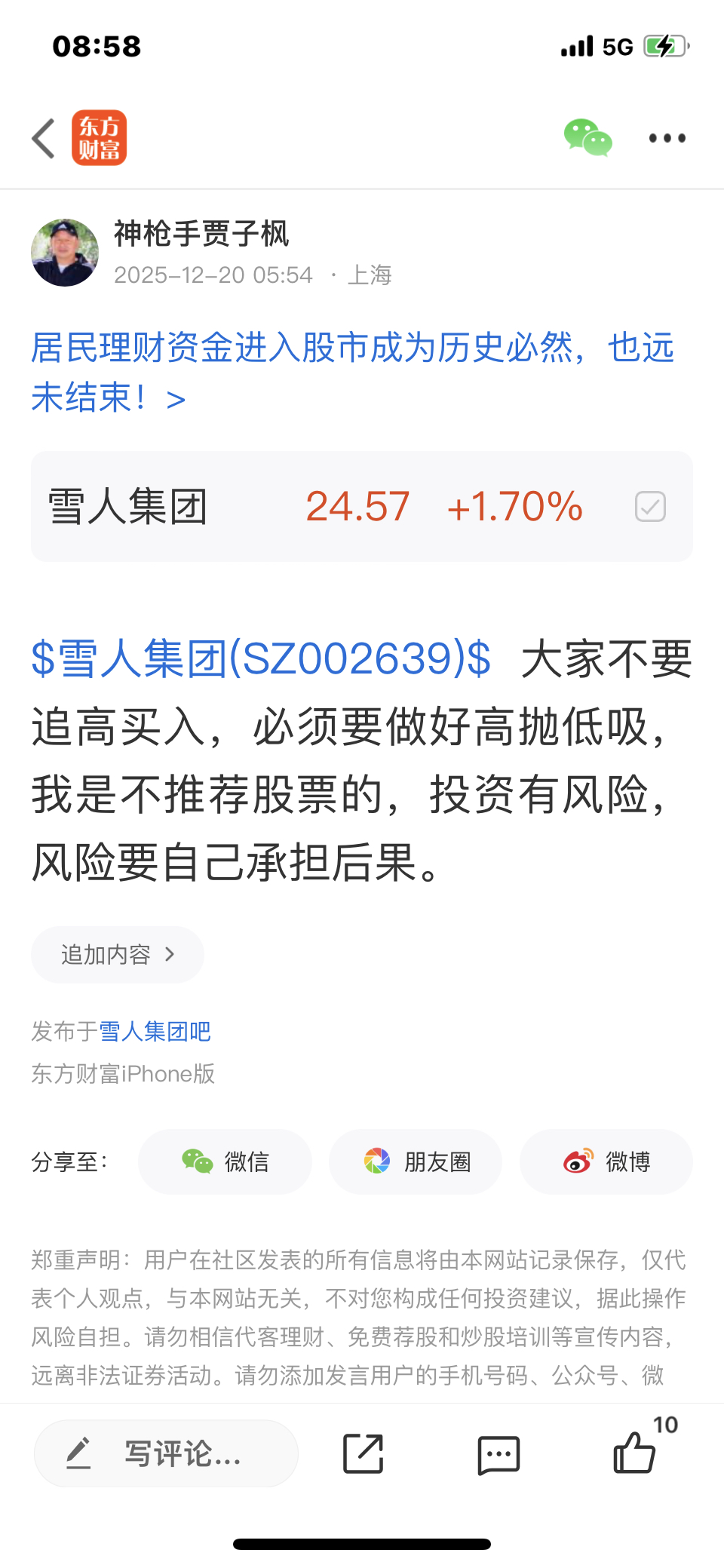 温馨提示: 1.根据《证券法》规定,禁止编造、传播虚假信息或者误导性信息,扰乱证券市场;2.用户在本社区发表的所有资料、言论等仅代表个人观点,与本网站立场无关,不对您构成任何投资建议。用户应基于自己的独立判断,自行决定证券投资并承担相应风险。《东方财富社区管理规定》