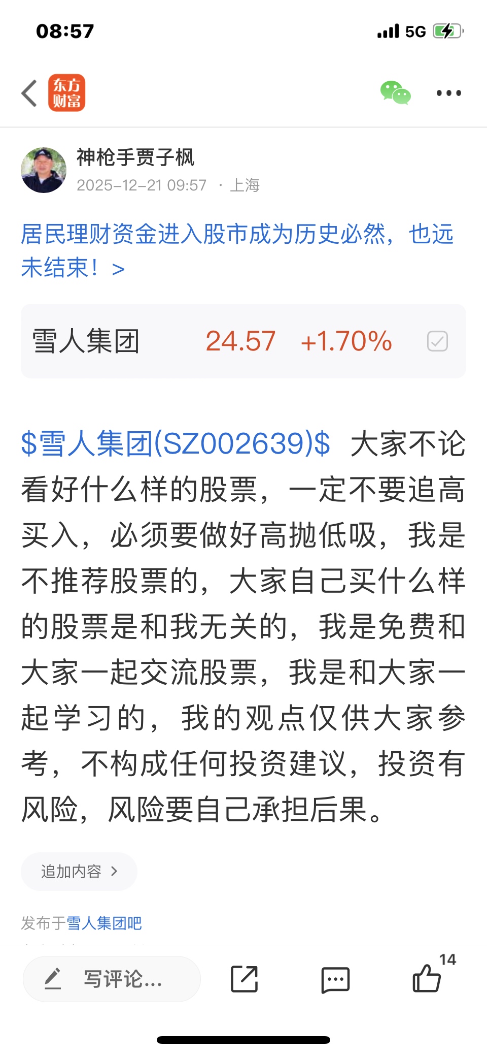 $雪人集团(SZ002639)$ 我是看震荡上涨的股票,大家不要追高买入,必须要做好高抛低吸,我的观点仅供参考,
