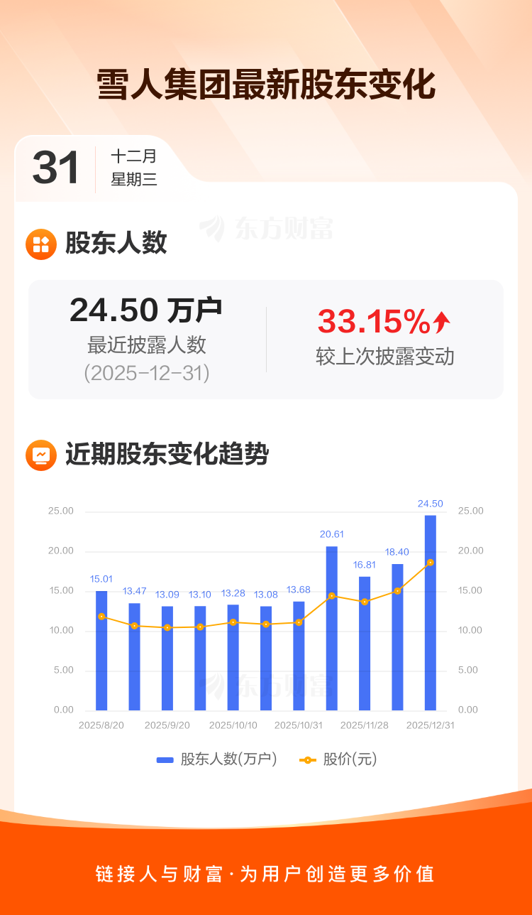 雪人集团:截至12月31日最新股东户数24.50万户,较上期增加33.15%