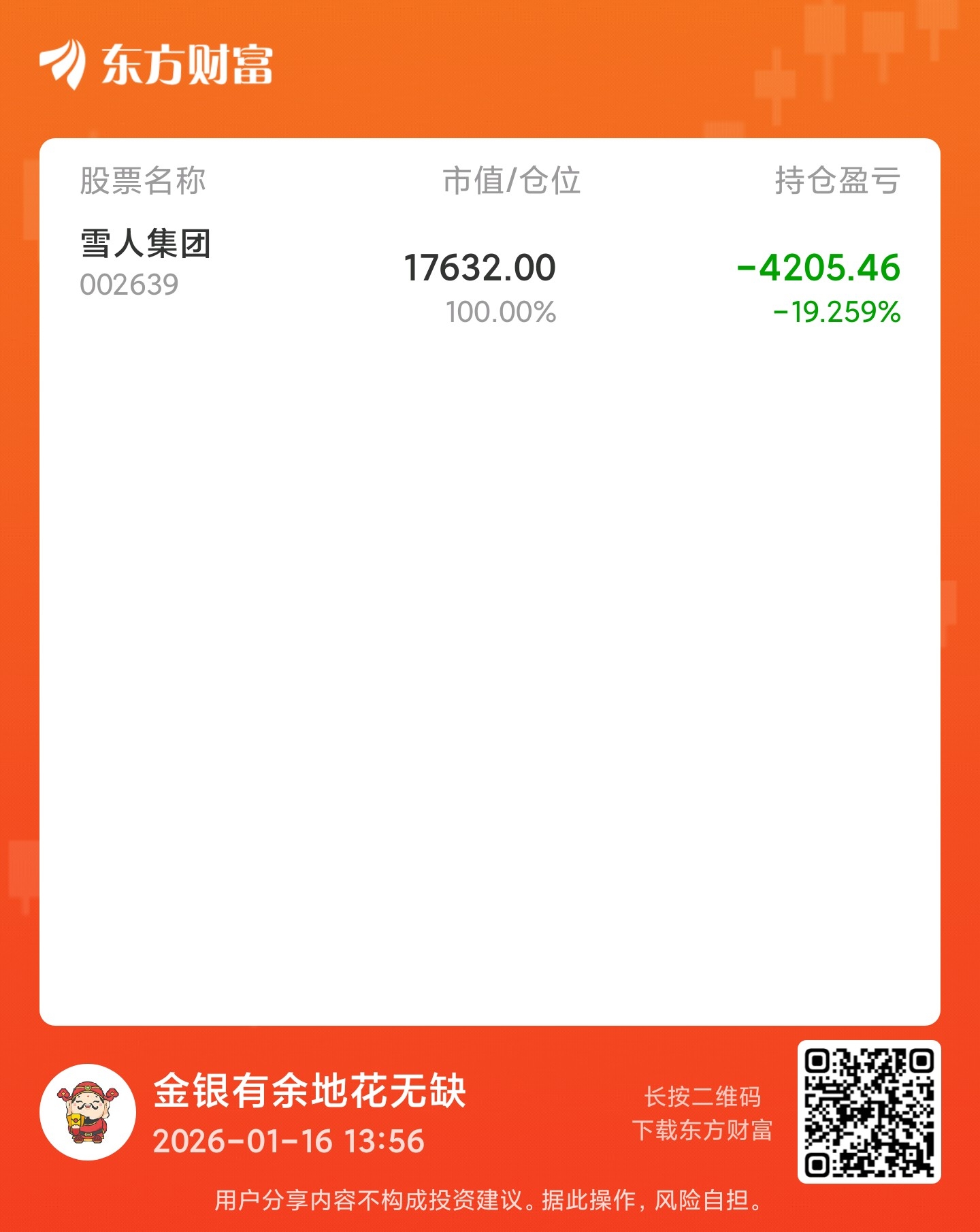 温馨提示: 1.根据《证券法》规定,禁止编造、传播虚假信息或者误导性信息,扰乱证券市场;2.用户在本社区发表的所有资料、言论等仅代表个人观点,与本网站立场无关,不对您构成任何投资建议。用户应基于自己的独立判断,自行决定证券投资并承担相应风险。《东方财富社区管理规定》