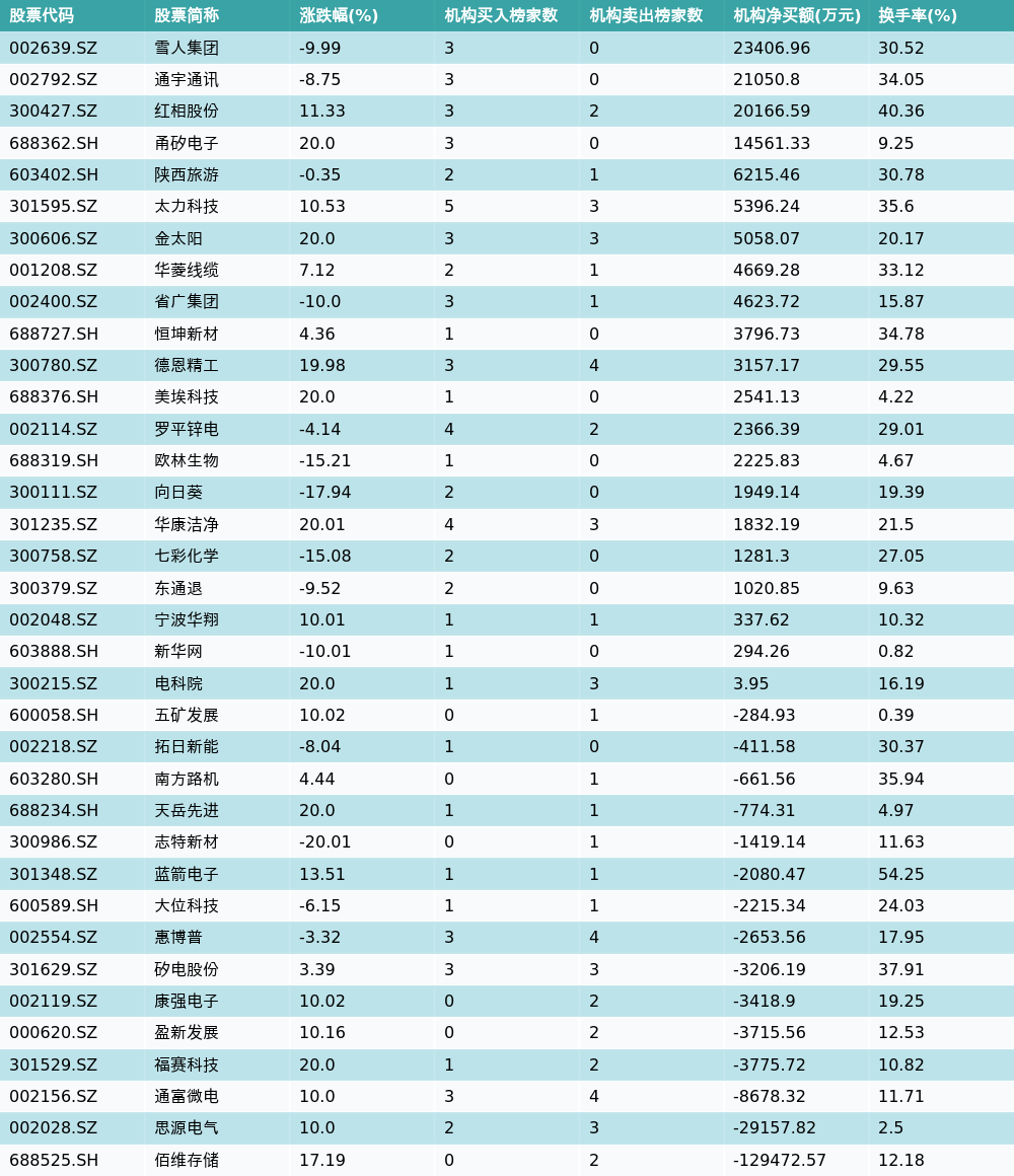 21智讯1月16日电,南财金融终端数据显示,因当日异动登上龙虎榜的个股中,36只沪深A股龙虎榜出现了机构的身影,机构合计净卖出65970.96万元,具体来看,机构净买入21只个股,净卖出15只个股。其中,机构净买入前三分别为雪人集团(002639.SZ)、通宇通讯(002792.SZ)与红相股份(300427.SZ),详情见下图:机构净卖出的个股中,前三分别为佰维存储(688525.SH)、思源电气(002028.SZ)与通富微电(002156.SZ)。