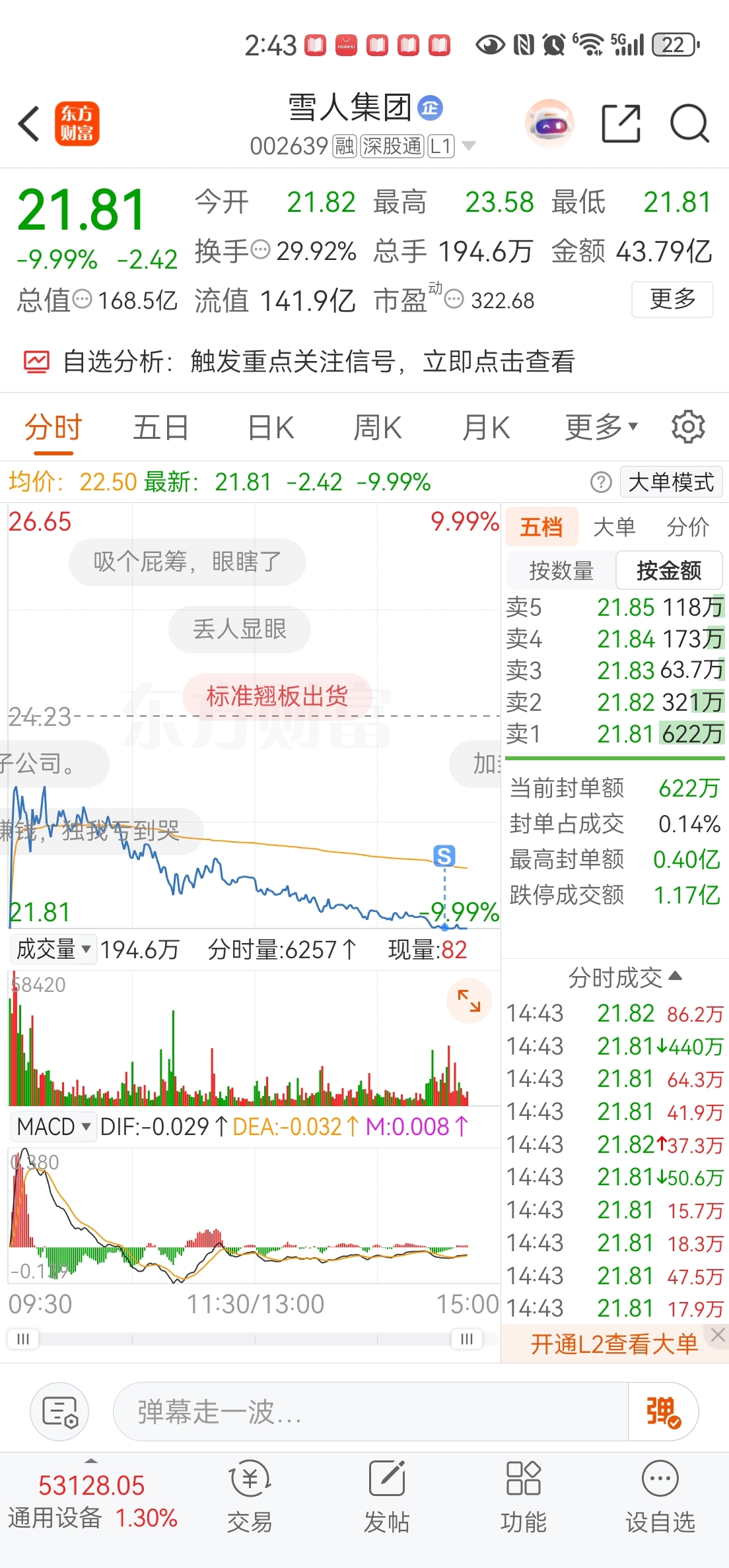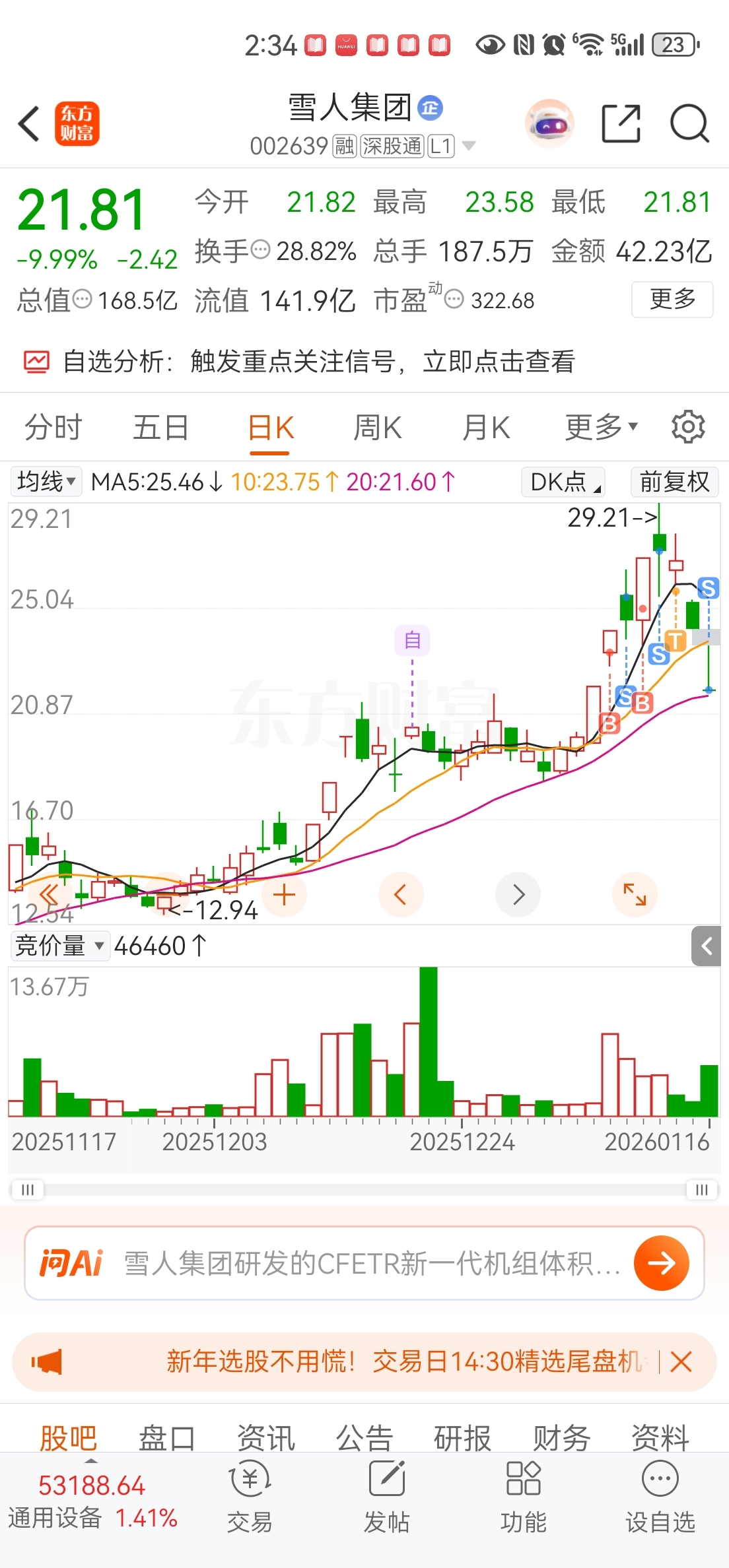 早上开盘,雪人集团冲高到23.58元,我当时还在想:“稳了,这是要探底回升的节奏!” 毕竟前面已经调整了几天,我以为今天资金要发力拉回去。