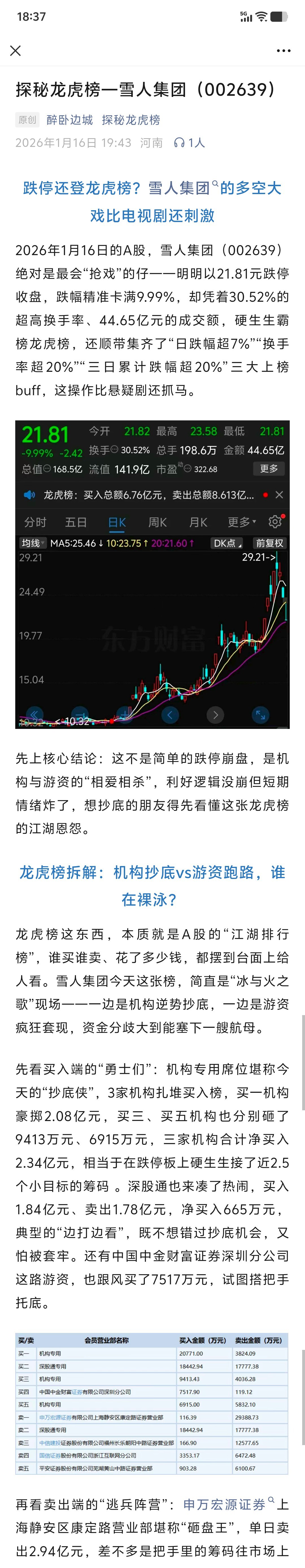 $雪人集团(SZ002639)$ 2026年1月16日的A股,雪人集团(002639)绝对是最会“抢戏”的仔——明明以21.81元跌停收盘,跌幅精准卡满9.99%,却凭着30.52%的超高换手率、44.65亿元的成交额,硬生生霸榜龙虎榜,还顺带集齐了“日跌幅超7%”“换手率超20%”“三日累计跌幅超20%”三大上榜buff,这操作比悬疑剧还抓马。