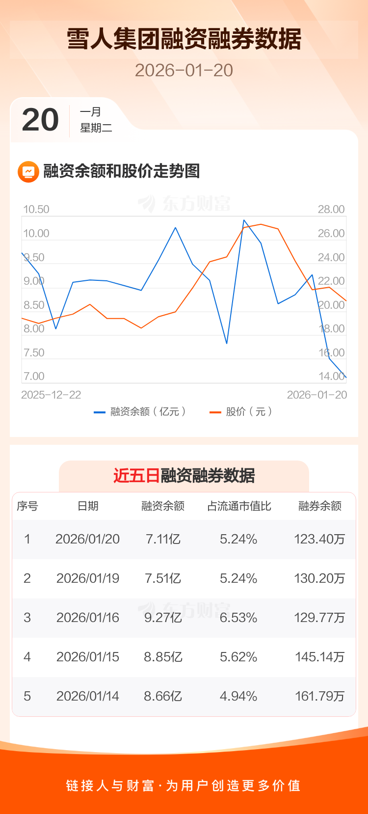 交易所最新数据显示,雪人集团于2026年1月20日获融资买入1.56亿元,融资偿还1.96亿元,当日融资净偿还4005.7万元。目前,该股融资余额7.11亿,占流通市值比例为5.24%。