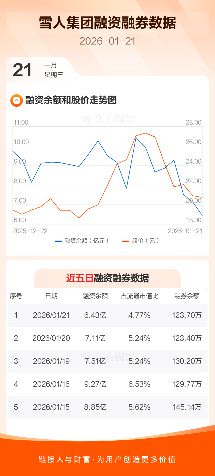 交易所最新数据显示,雪人集团于2026年1月21日获融资买入9396.50万元,融资偿还1.62亿元,当日融资净偿还6822.32万元。目前,该股融资余额6.43亿,占流通市值比例为4.77%。