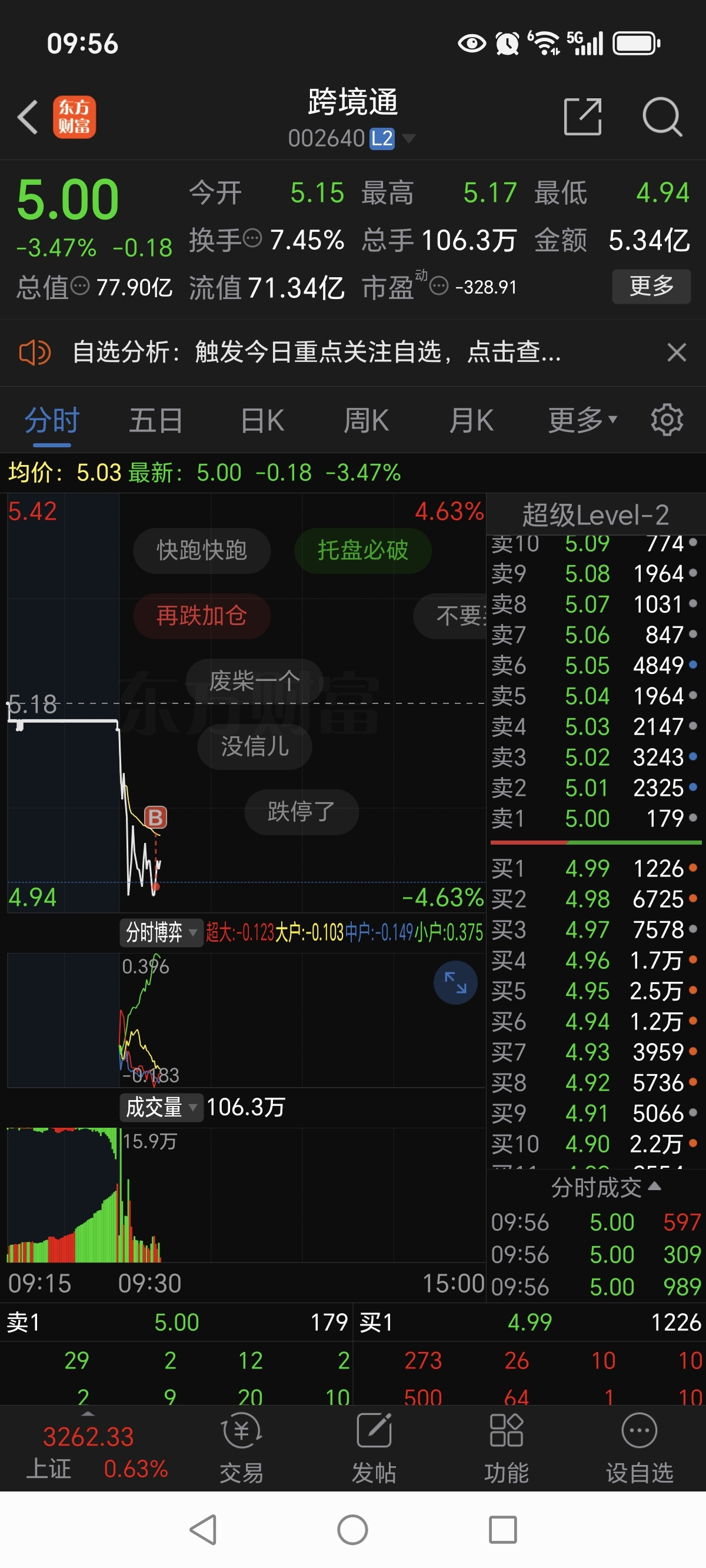 $跨境通(SZ002640)$ 4.96捡一点