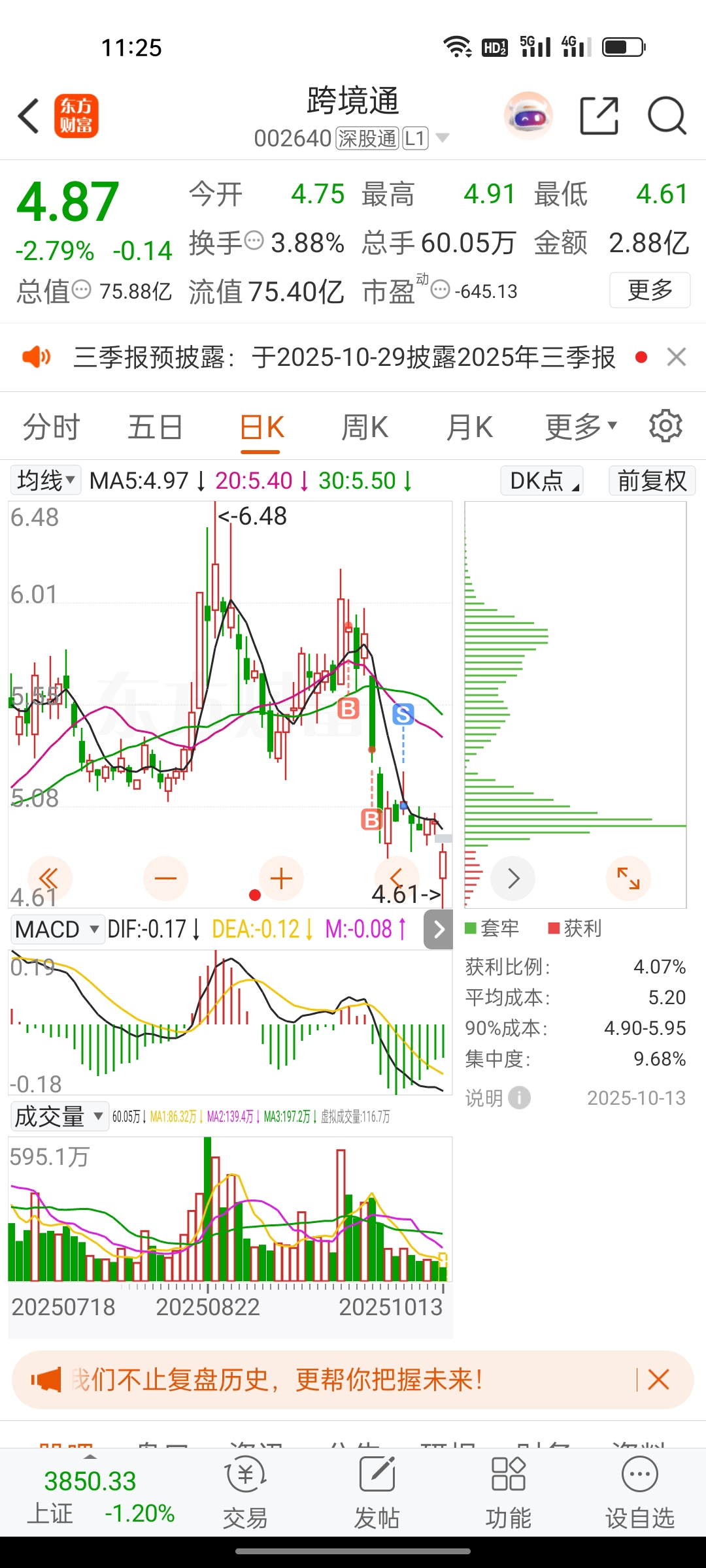 $跨境通(SZ002640)$ 还好前几天割肉跑掉了,看看这个筹码获利盘,这个股票要是短期能涨除非有奇迹发生。