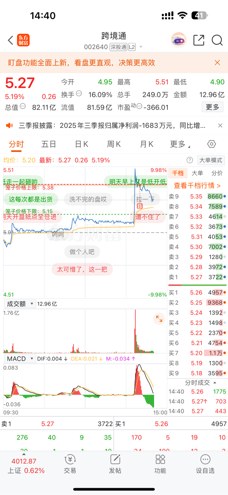 $跨境通(SZ002640)$ 买在高点,希望明天给机会走