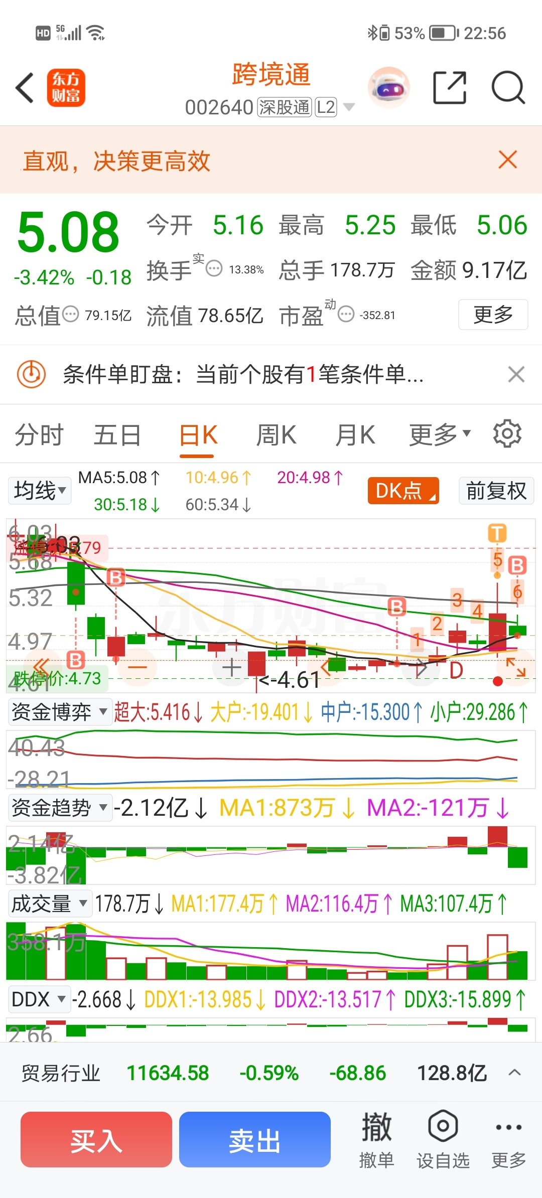 $跨境通(SZ002640)$ 哎昨天尾盘5.3进的!今天早上就给了个下马杀!5.1又补了点!