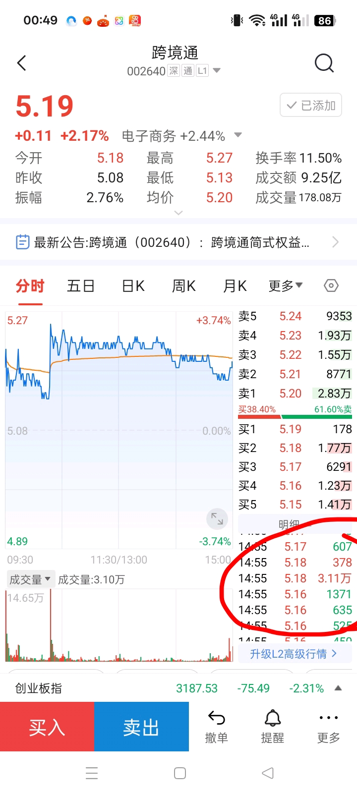 $跨境通(SZ002640)$ 各算算上周五尾盘的单笔三万手买入超大单多少钱?