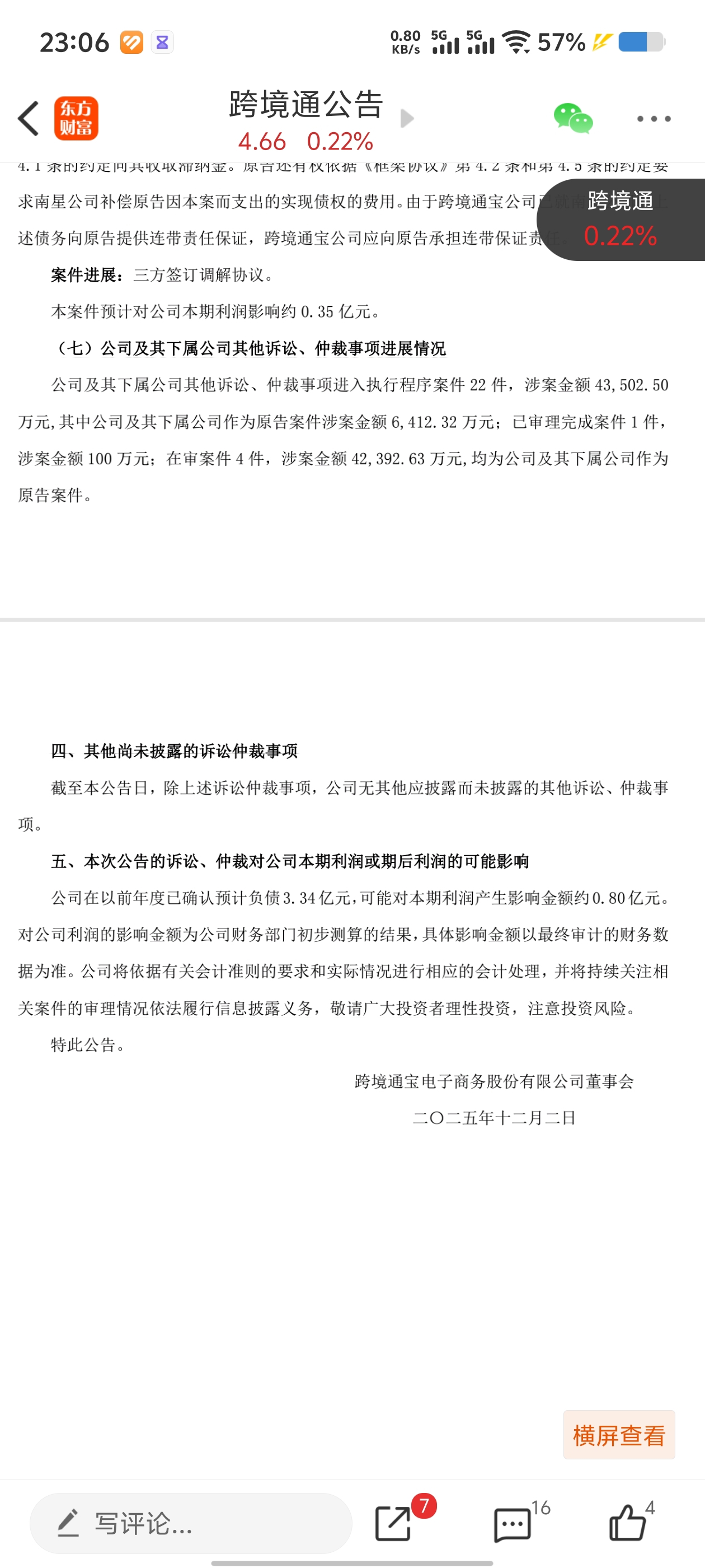 $跨境通(SZ002640)$ 总结一句话:诉讼输了,预计要赔0.8亿,劝投资者理性看待。