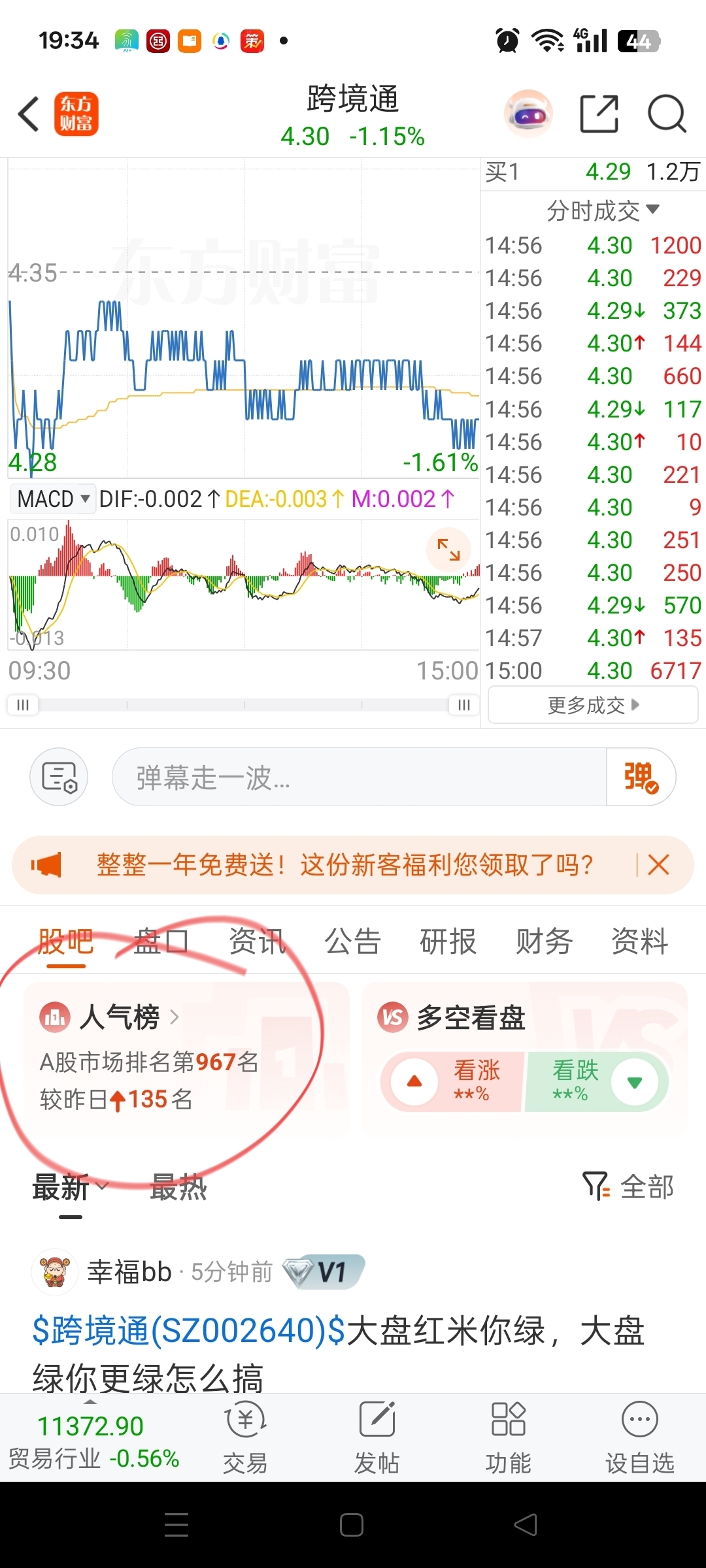 $跨境通(SZ002640)$ 天天阴跌还好意思买热度买人气