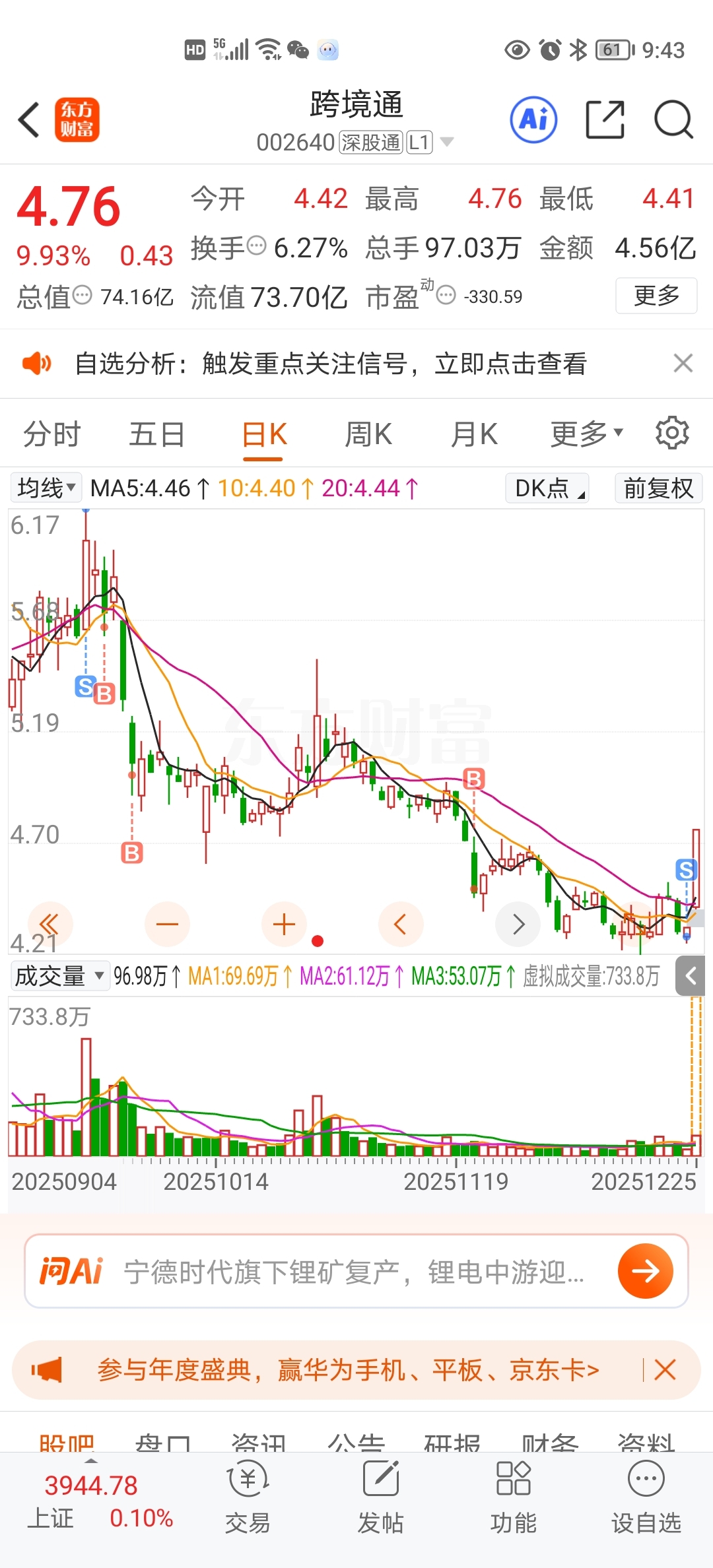$跨境通(SZ002640)$ 昨天最低点全仓买了,大家都来嘲笑我吧