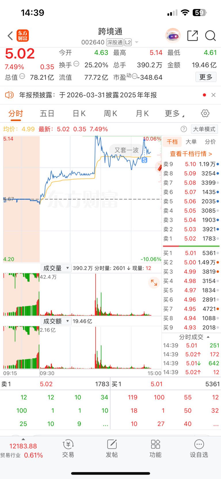 $跨境通(SZ002640)$ 哎。拉伸没碰上好时候啊。尾盘都没放量拉。不过还是感谢主力给了点肉吃