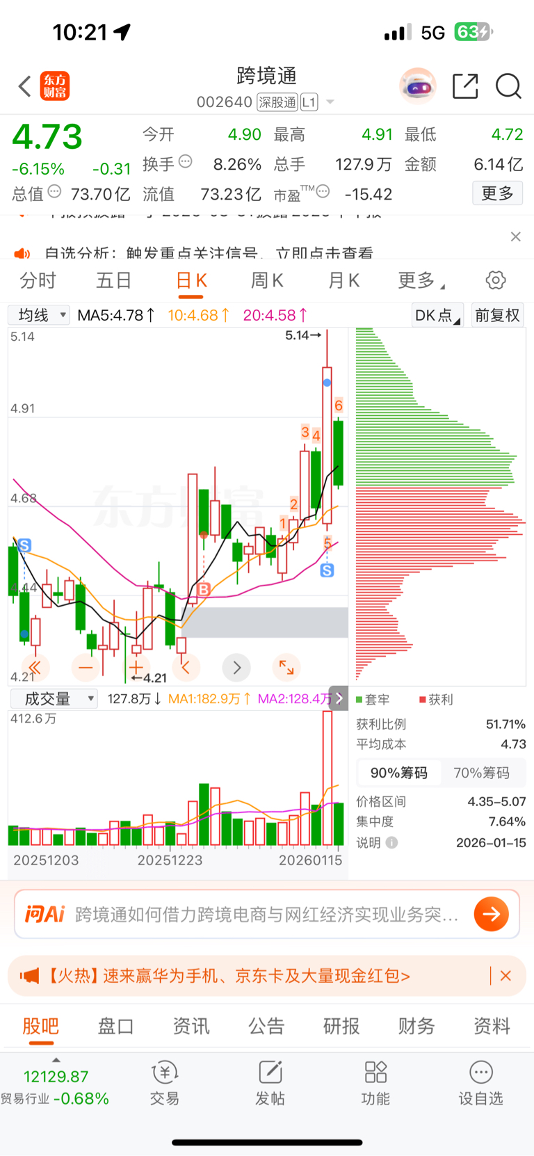 $跨境通(SZ002640)$ 感恩不贪心的自己