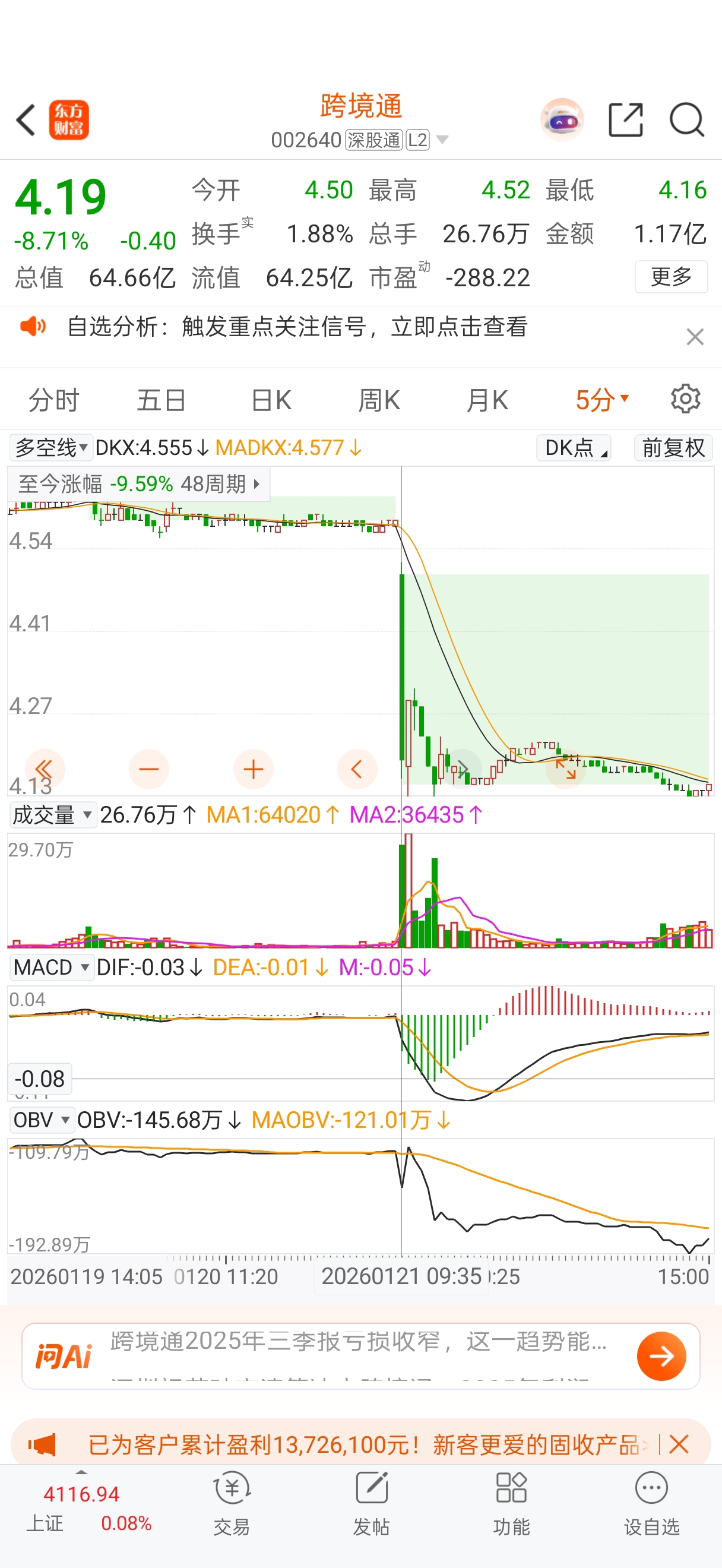 $跨境通(SZ002640)$ 开盘五分钟成交一个亿,但是全天成交快10亿了,完全可以在低位再买回来,这个下跌是纯粹为了让散户割肉,至于龙虎榜,没什么参考价值。明天可能会继续下跌,再复制一遍今天的分时图,当然,也可能直接修复回去,因为有利好,如果来个涨停,那今天割肉的就被洗掉了,如果继续下跌,那今天卖出的人就认为自己是股神了。