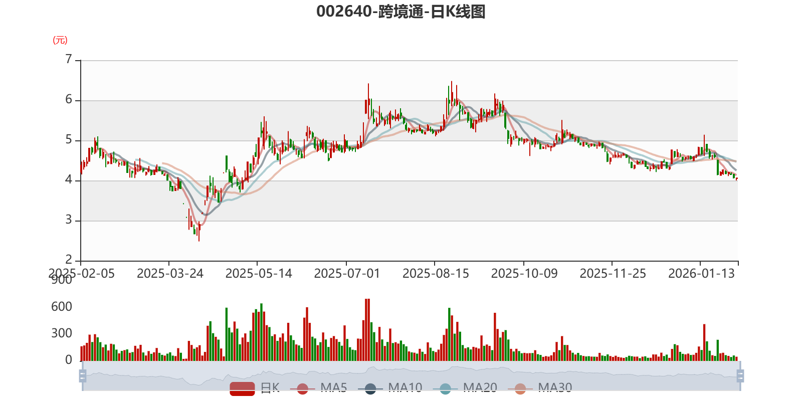 中证智能财讯跨境通(002640)1月30日晚间披露2025年度业绩预告,预计2025年实现营业收入52亿元至56亿元;归母净利润亏损3.9亿元至4.9亿元,上年同期亏损4.79亿元;扣非净利润亏损3.3亿元至4.3亿元,上年同期亏损3.91亿元;基本每股收益-0.2535元/股至-0.3184元/股。以最新收盘价计算,市净率(LF)约7.41倍,市销率(TTM)约1.17倍。