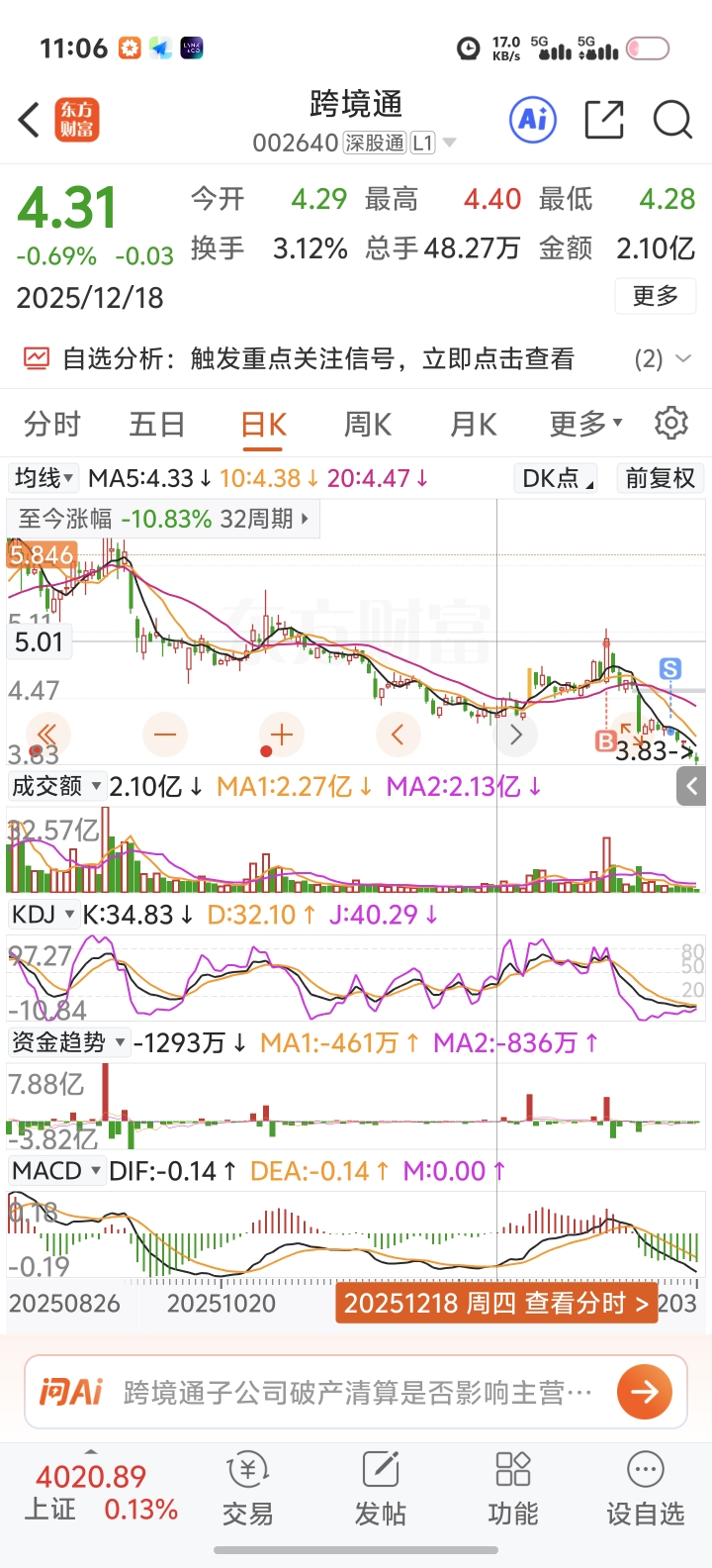 $跨境通(SZ002640)$ 成本5.864,亏了33个,沃日