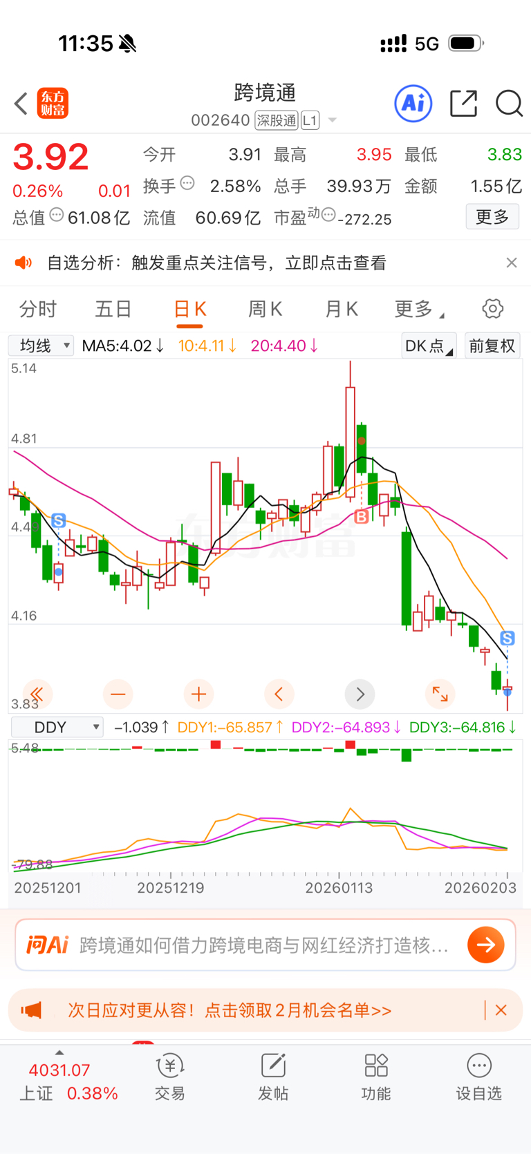 $跨境通(SZ002640)$ 成本4.92今天割肉了赔了一万五