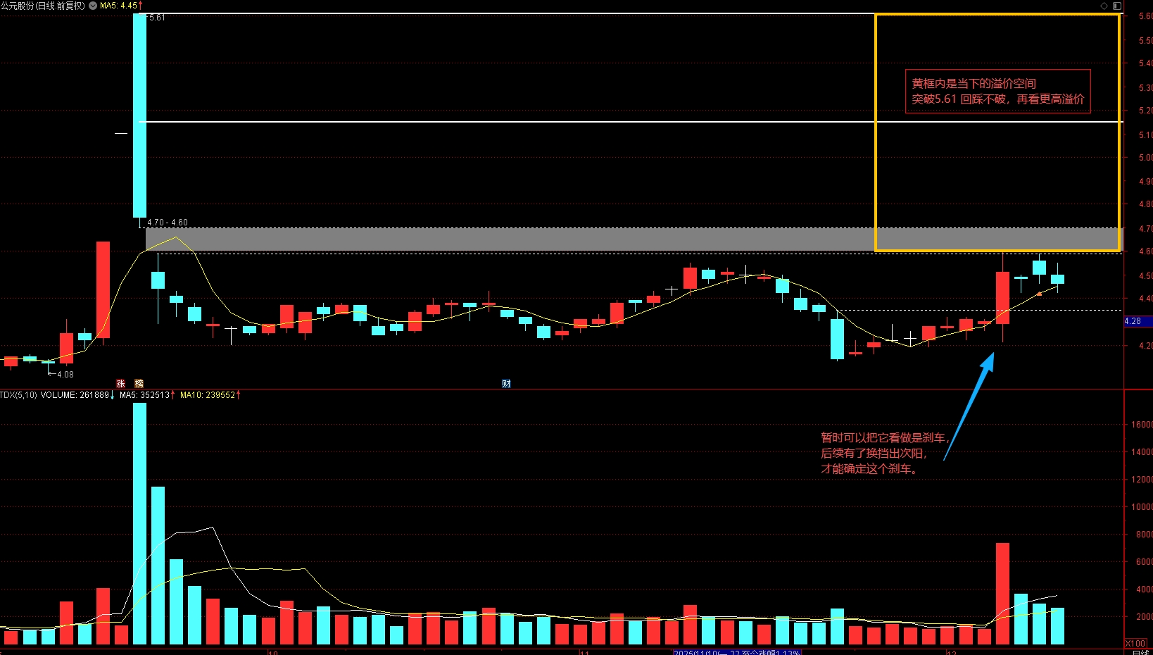 1.暂时把它(蓝箭指向柱)看作是“刹车”2.后续出次阳,收盘打过4.59和4.7