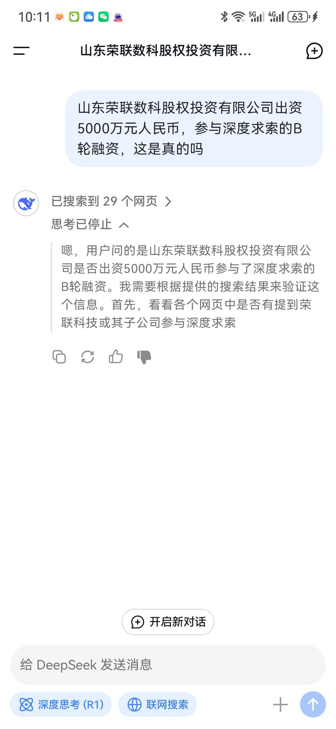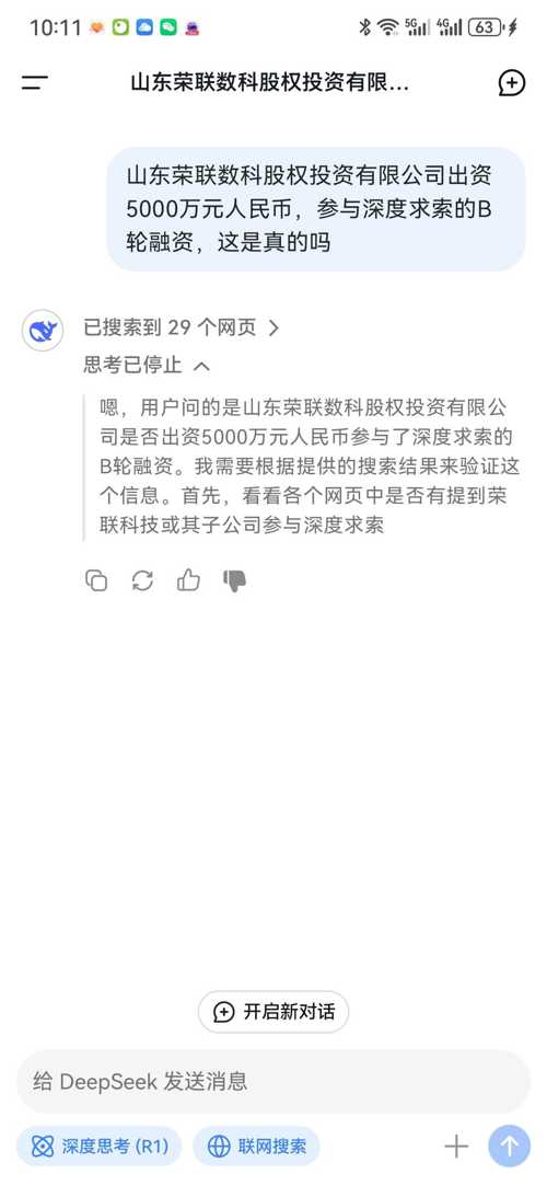 - **时间与金额**:2023年12月,荣联科技旗下全资子公司山东荣联数科股权投资有限公司出资5000万元人民币,参与深度求索的B轮融资。该轮融资总额超3亿美元,投后估值约30亿美元。