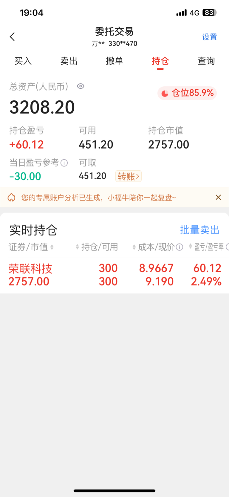 不急,小账户做长期投资,决心赚一瓶青花郎计划不变。大账户做短线