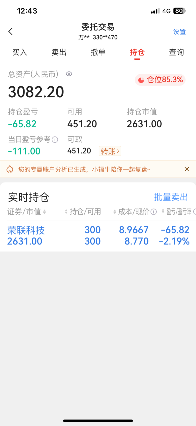 持有两周多时间了,从大赚6%到今天倒亏2个点,看来我的青花郎酒要泡汤了。选股错误