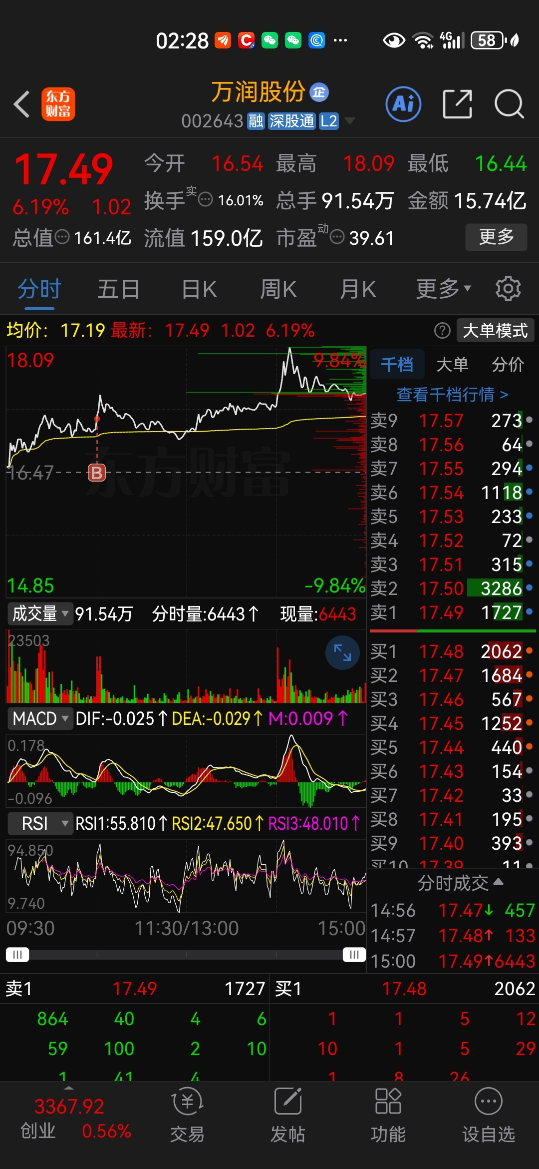 $万润股份(SZ002643)$ 好烦啊,一买他就上去了,才买了1000股,今天应该可以低吸吧,我不想追高,主力今天应该会低开让我加仓上车