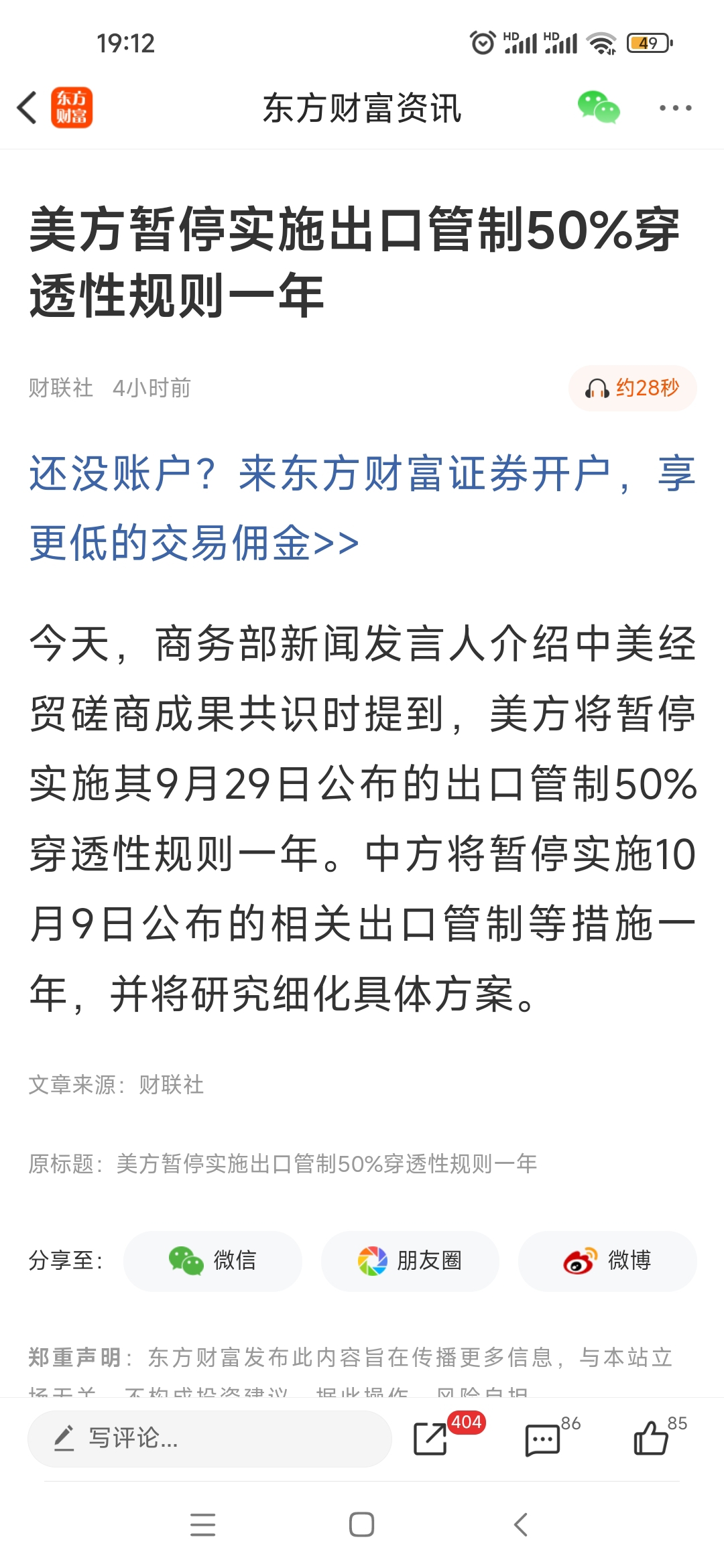 $华宏科技(SZ002645)$ 今天,商务部新闻发言人介绍中美经贸磋商成果共识时提到,美方将暂停实施其9月29日公布的出口管制50%穿透性规则一年。中方将暂停实施10月9日公布的相关出口管制等措施一年,并将研究细化具体方案。
