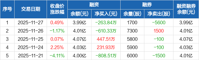 华宏科技:融资净偿还263.84万元,融资余额3.99亿元(11-27)