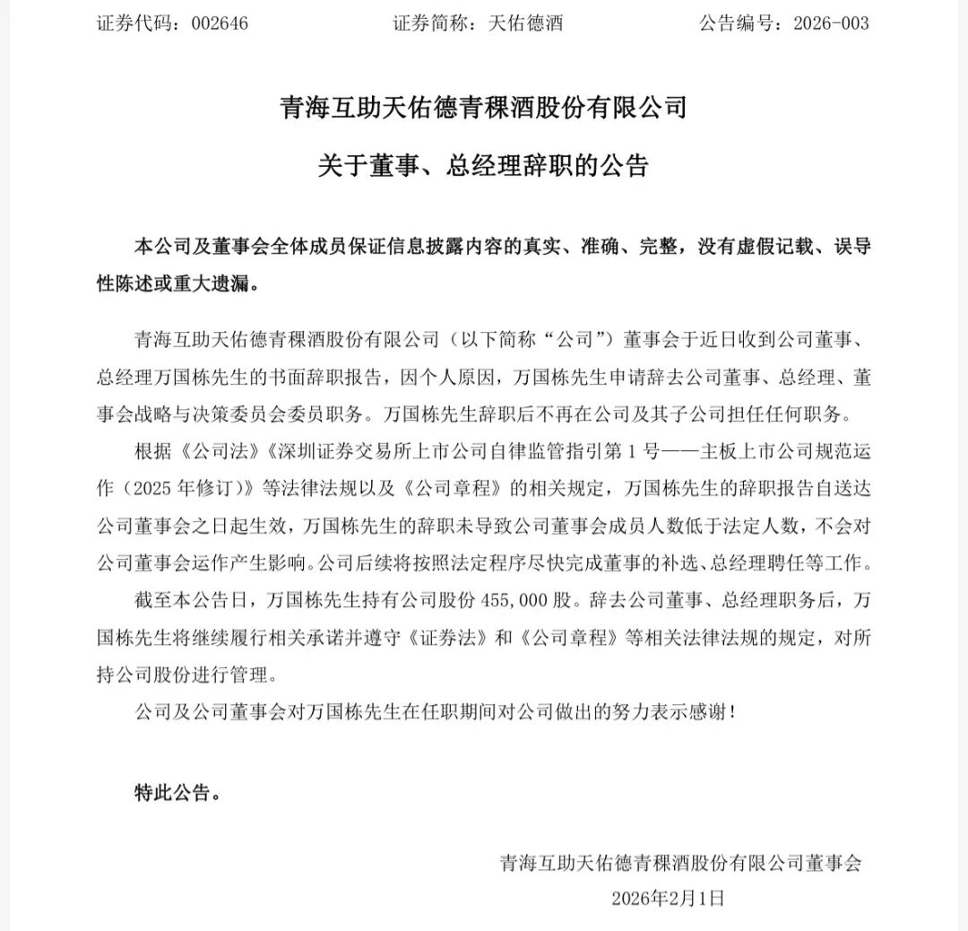 近日,天佑德酒公告称,因个人原因,万国栋申请辞去公司董事、总经理、董事会战略与决策委员会委员职务,辞职后不再在公司及其子公司担任任何职务。