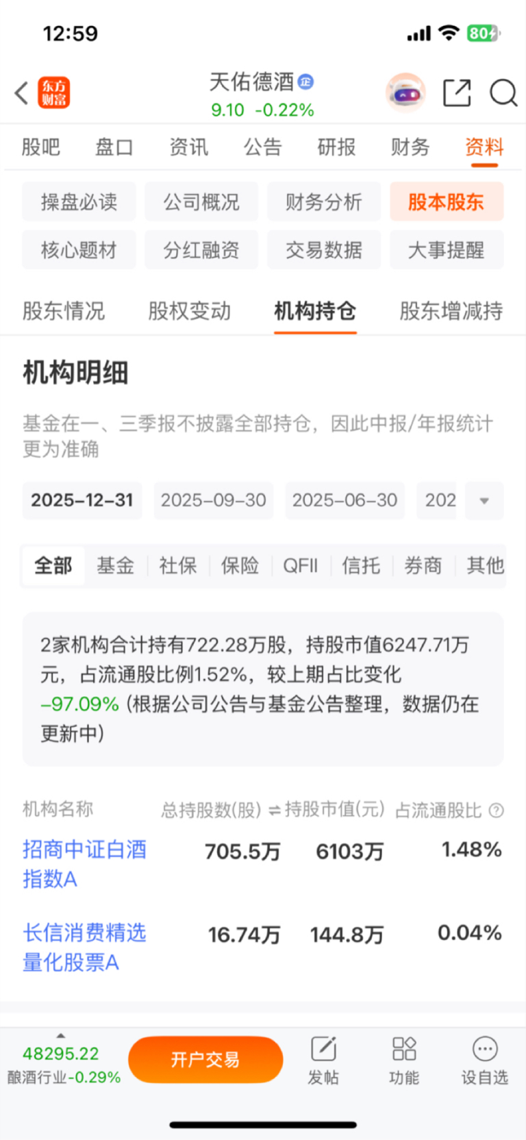 $天佑德酒(SZ002646)$ 招商中证应该减持完成,剩下个量化的搅局,这点持股数不够一个波动的,大概率应该都是韭菜互相拉扯