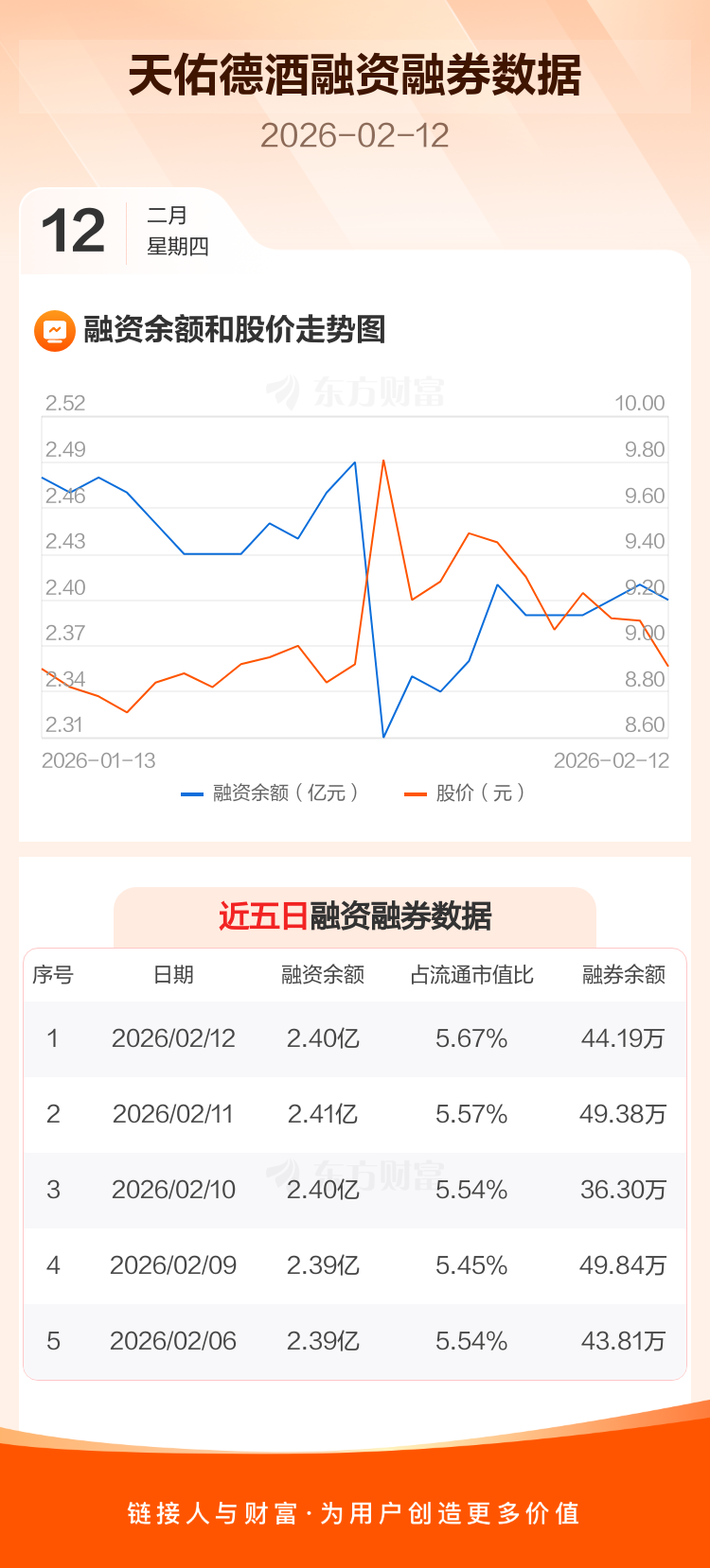 交易所最新数据显示,天佑德酒于2026年2月12日获融资买入1063.08万元,融资偿还1168.99万元,当日融资净偿还105.91万元。目前,该股融资余额2.40亿,占流通市值比例为5.67%。