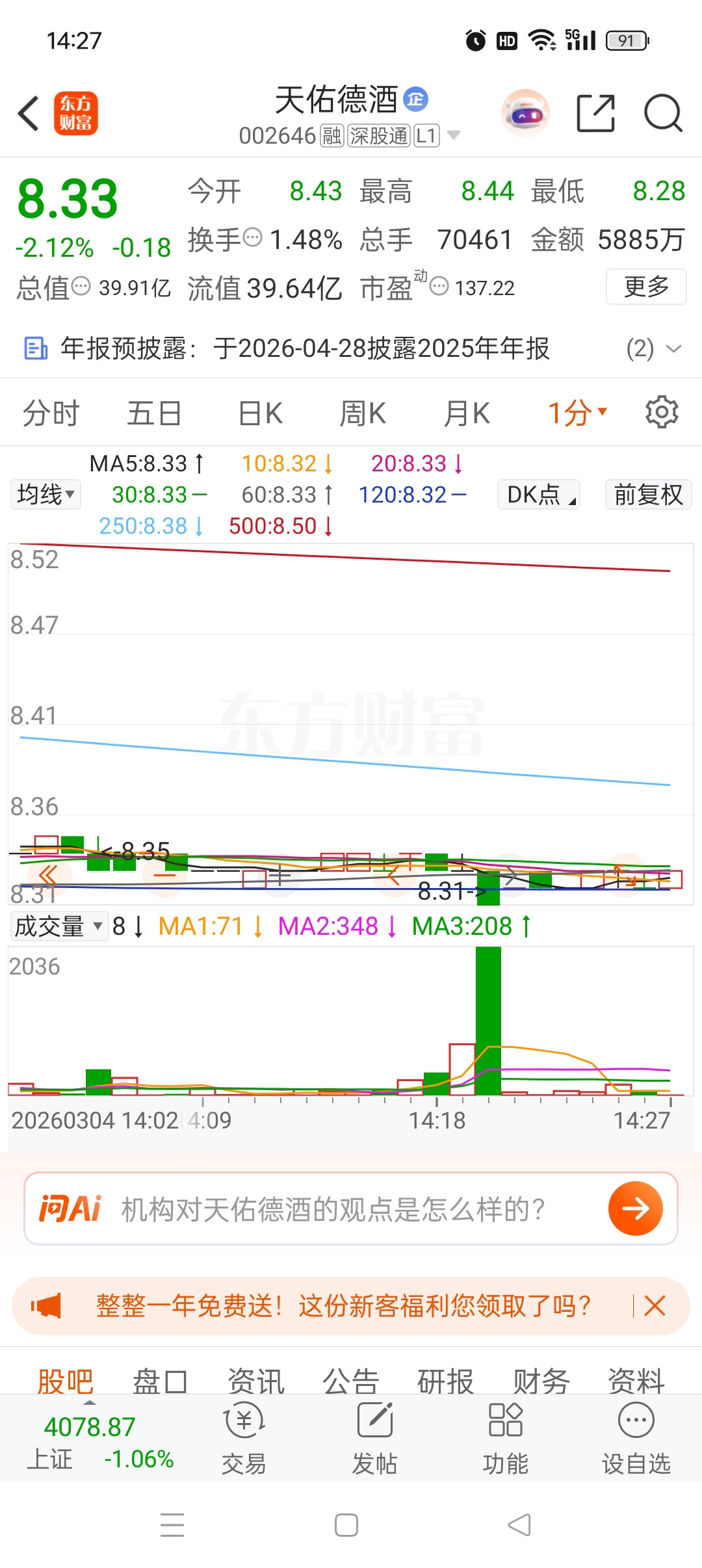 $天佑德酒(SZ002646)$ 一分时8.31必须回踩,随便怎么拉都还要跌