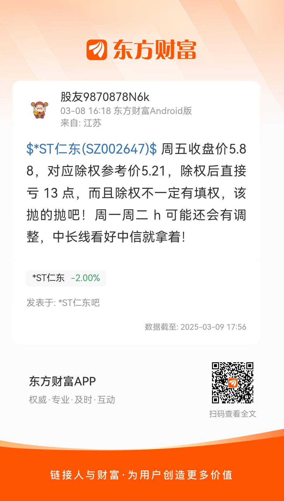 $*ST仁东(SZ002647)$ 周五收盘价5.88,对应除权参考价5.21,除权后直接亏 13 点,而且除权不一定有填权,该抛的抛吧!周一周二 h 可能还会有调整,中长线看好中信就拿着!