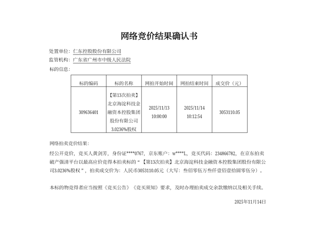$*ST仁东(SZ002647)$ 出拍卖结果了