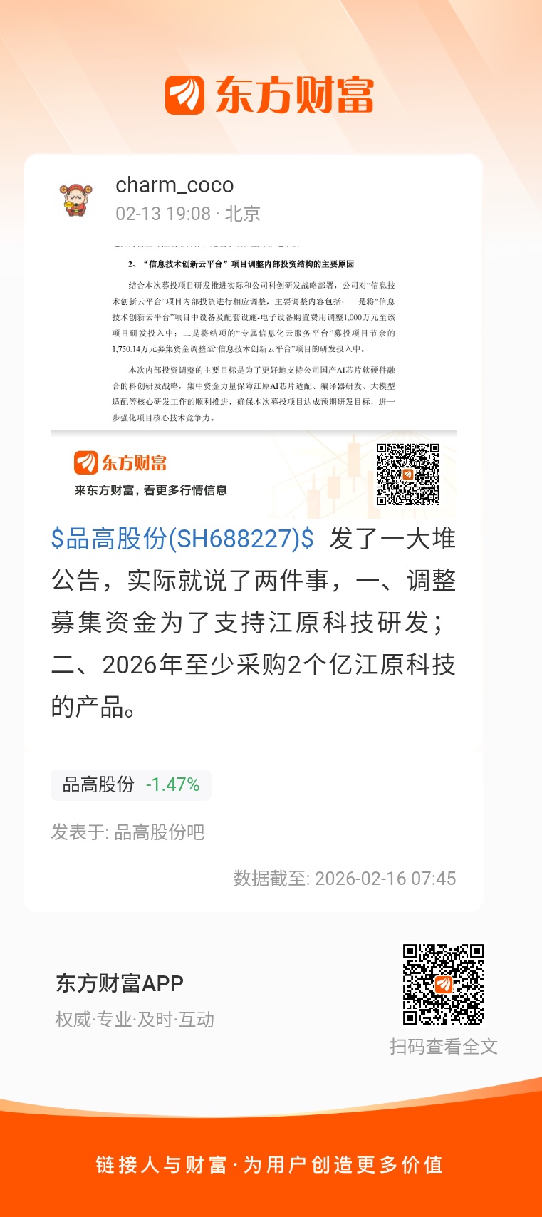 $品高股份(SH688227)$ 发了一大堆公告,实际就说了两件事,一、调整募集资金为了支持江原科技研发;二、2026年至少采购2个亿江原科技的产品。