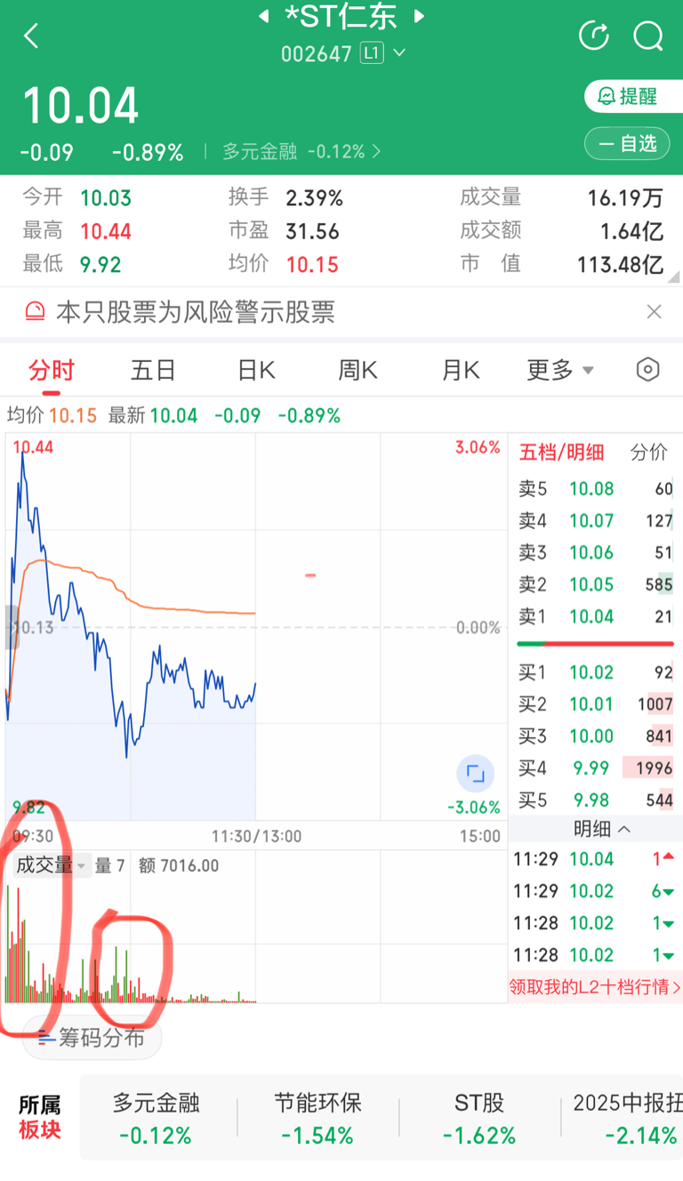 $*ST仁东(SZ002647)$ 分析下今天的量能,早上上涨是持续性的放量,不是单一的量柱,说明资金持续堆上去的,下跌无量,在三个低点放量说明资金承接,所以今天走势是洗盘诱空