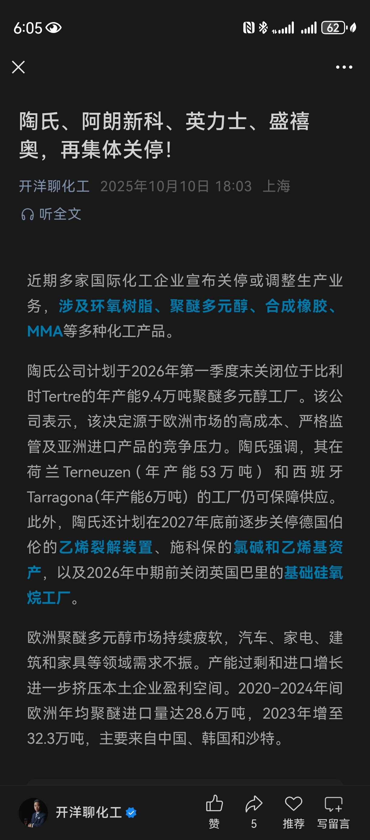 $卫星化学(SZ002648)$ 怎么说 乙烯裂解关停,石油暴跌不是乙烷也要跌 供需双击 我可是觉得卫星化学绝对要借港口费压低股价然后反弹,持仓不动逢低跟进,跌到盈利线下就加仓