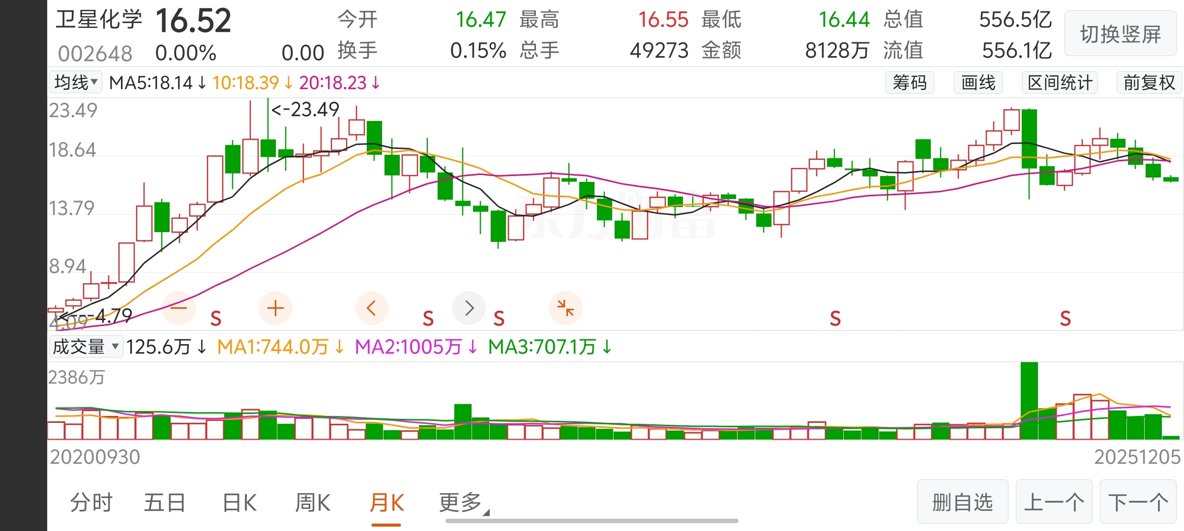 $卫星化学(SZ002648)$ 简单看下 这个股票走势非常有规律涨跌涨跌,现在已经是这轮的底部了,可以分批进去不会亏钱的!