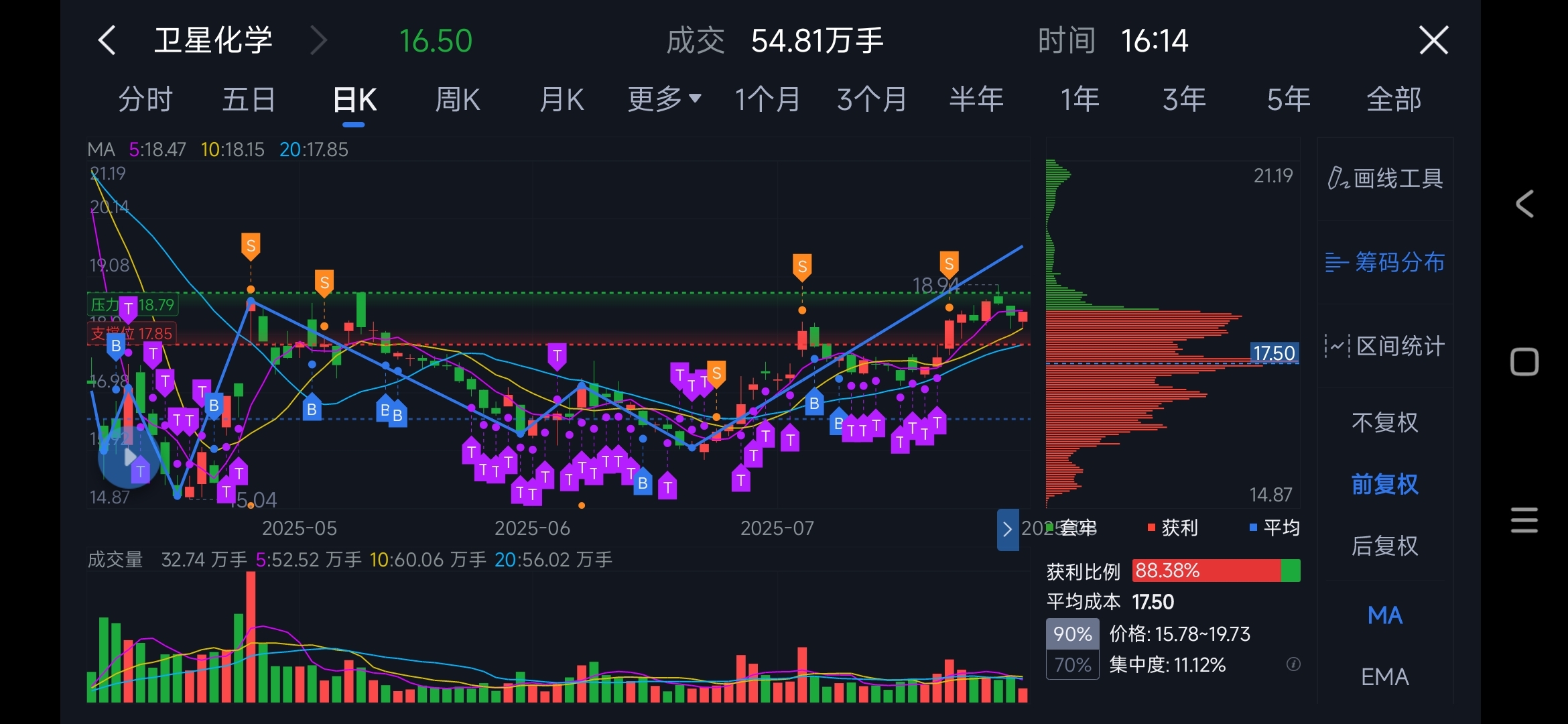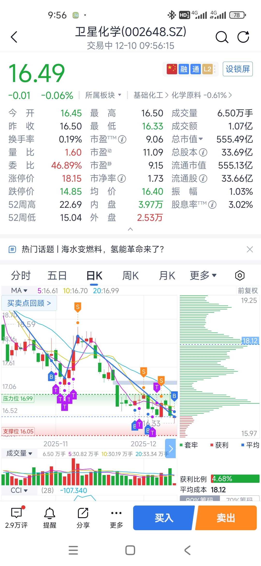 我乃卫星化学幸运体,每次进来都能赚钱,今天我进了17.36,老铁们一起发财。
