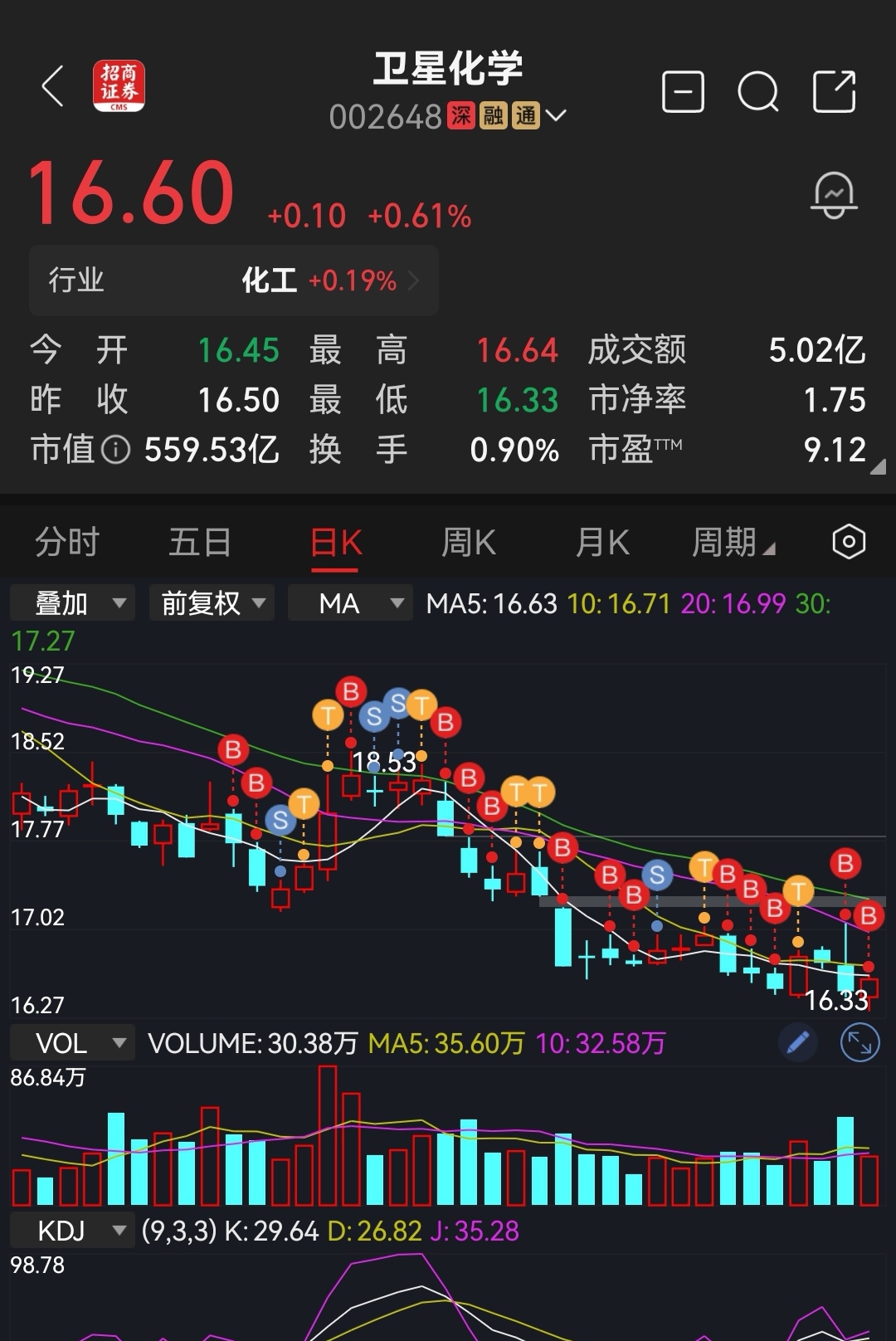 $卫星化学(SZ002648)$ 公告今日完成昨日承诺增持1亿元的46.8%,即今日盘中增持4680万,计划明天继续增持,在周五收盘前完成1亿增持,特此公告,由此造成的股价波动敬请广大投资者注意风险。