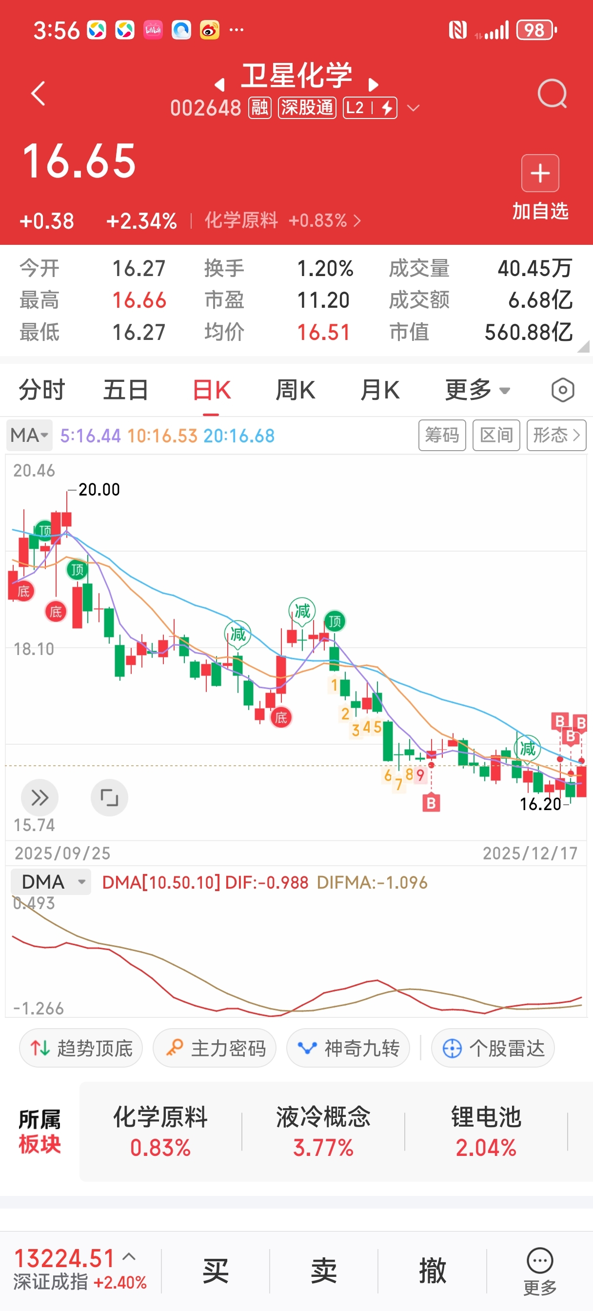 $卫星化学(SZ002648)$ 尾盘又加仓了!打满了,现在33手,16.52的本,感觉有机会