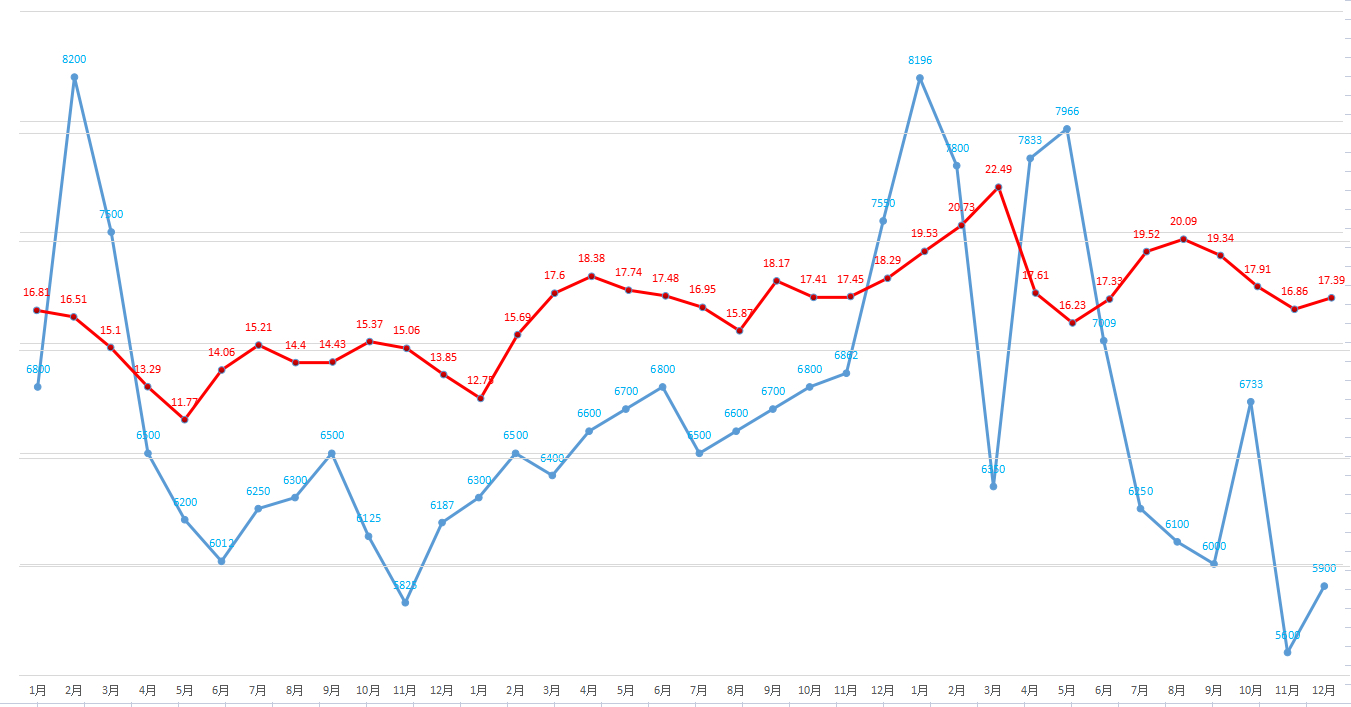 $卫星化学(SZ002648)$ 我整理了一份关于股价与丙烯酸的价格走势及往年价格走势,1-3月触底反弹的概率较大。